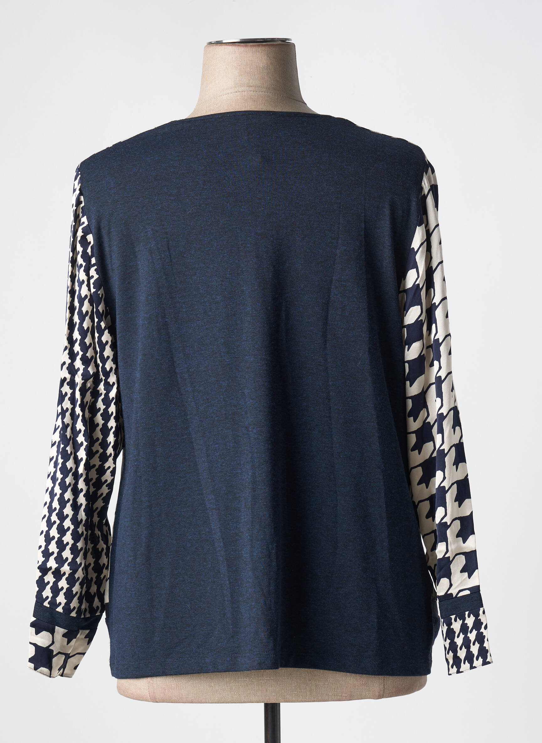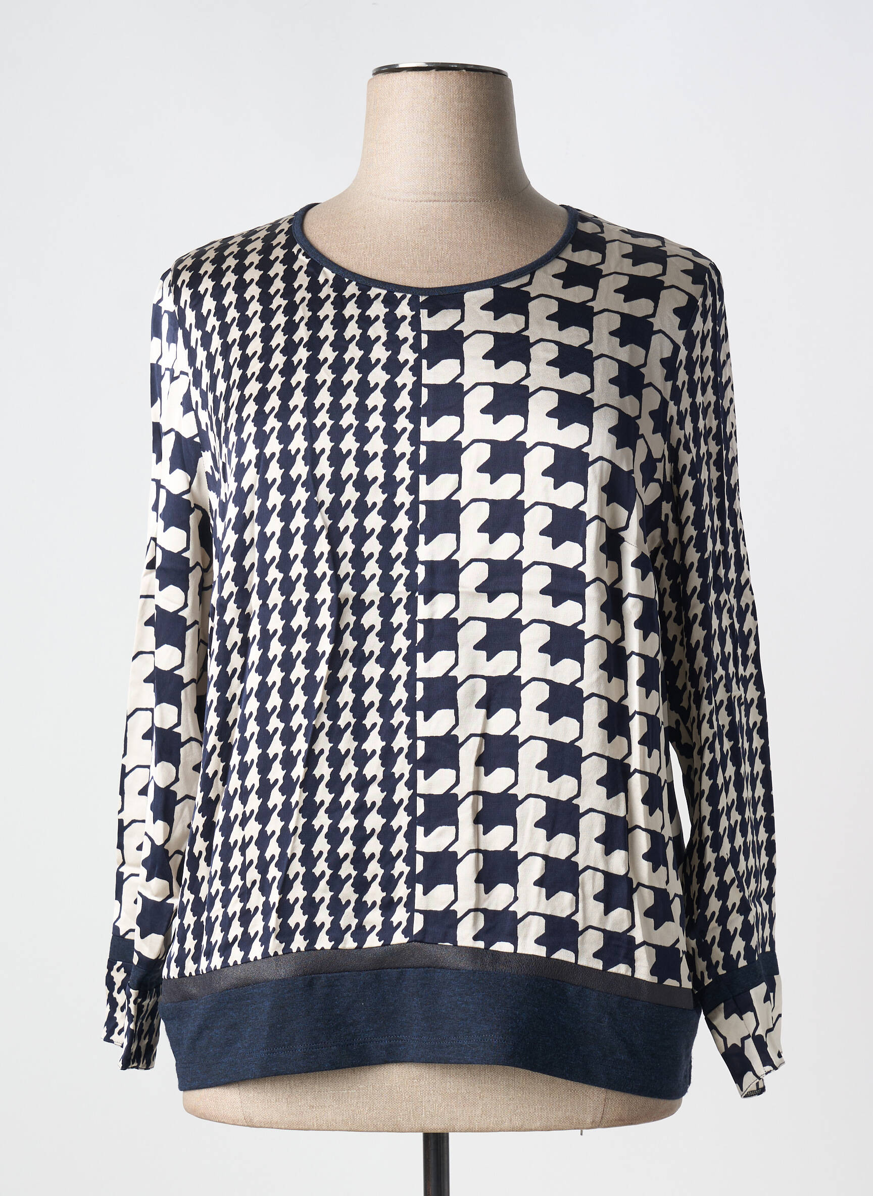 Profitez d'une opportunité à petit prix avec cette blouse MERI & ESCA pour femme, qui se distingue par son design graphique unique associant deux motifs contrastés bleu marine et crème pour un effet visuel moderne et tendance. Son encolure ronde et sa coupe confortable en font un choix parfait pour apporter une touche d'originalité chic à votre dressing sans vous ruiner.