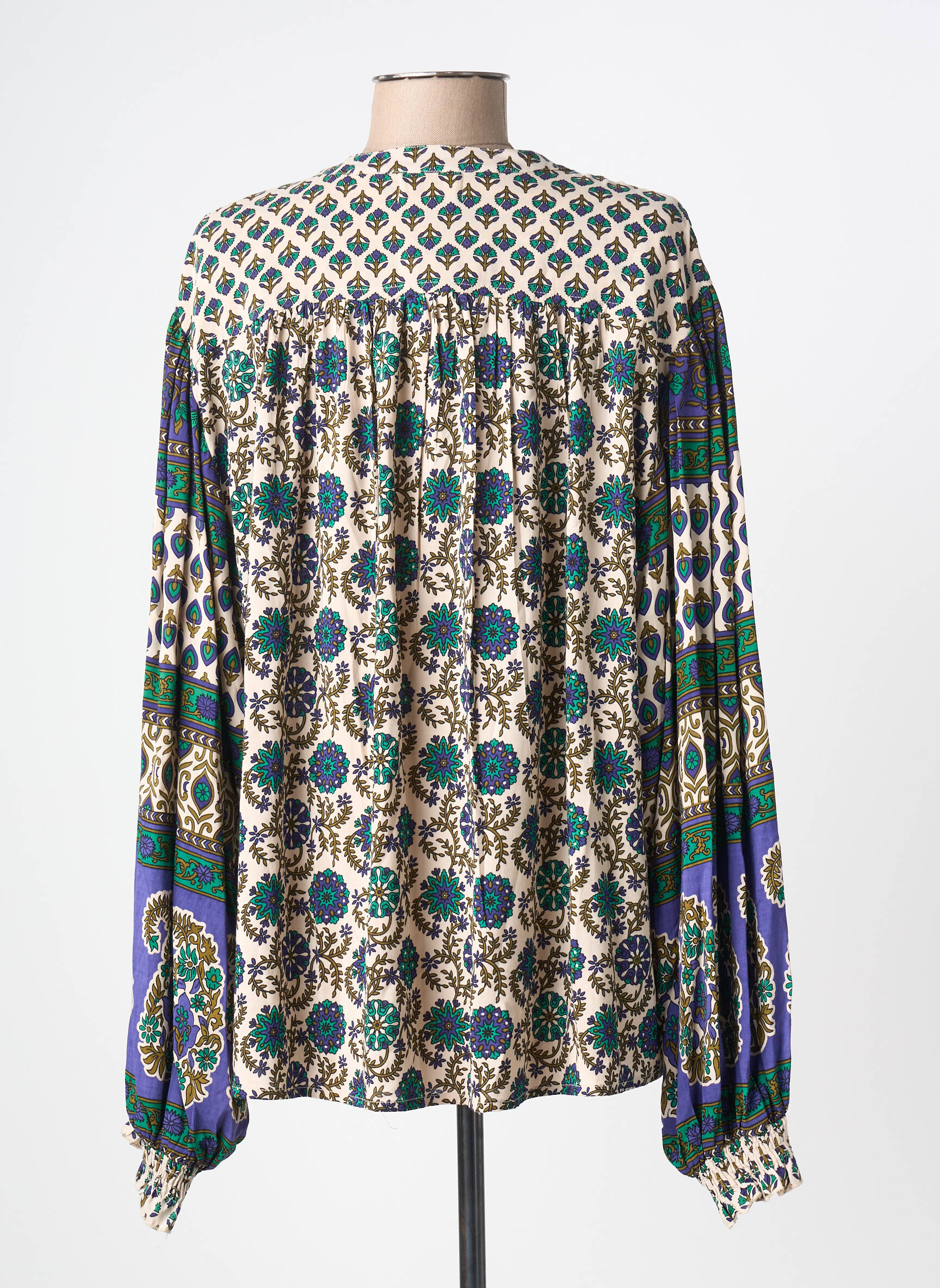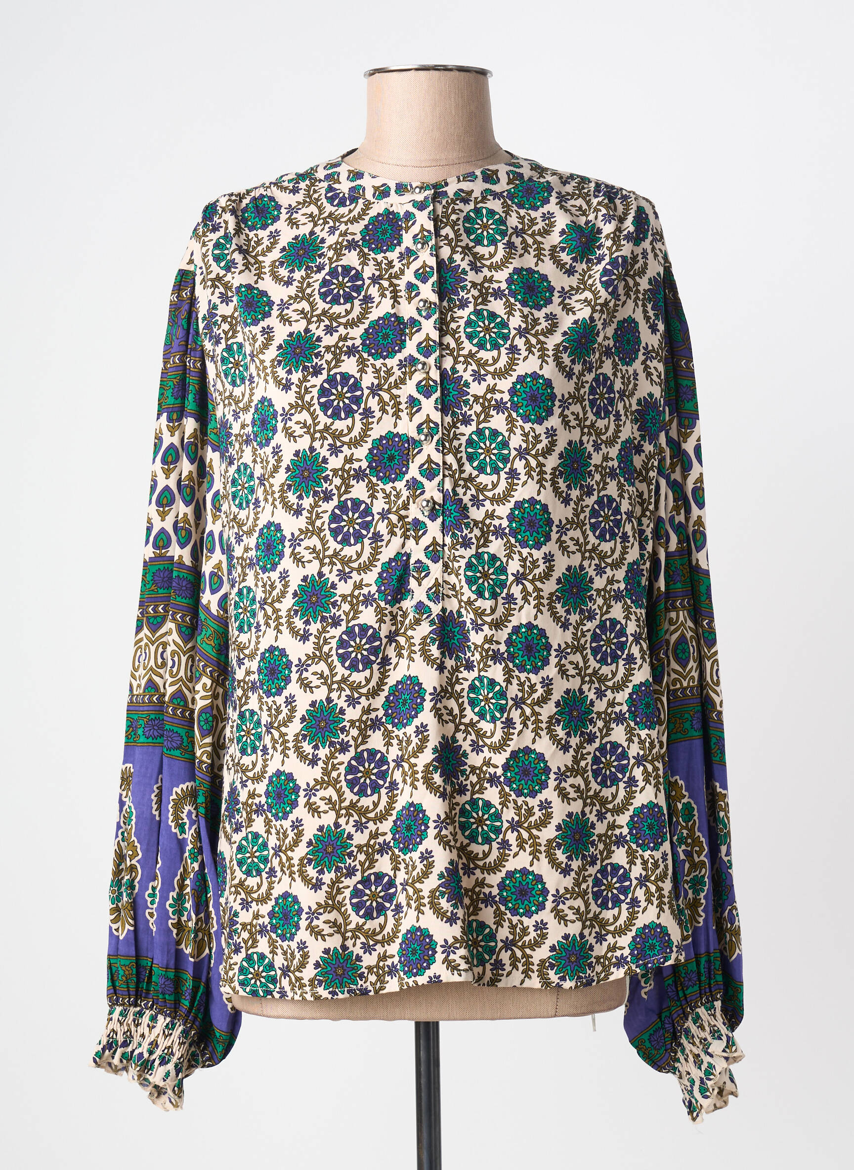 Craquez pour cette blouse MISS JUNE à prix tout doux, une pièce au look bohème-chic idéale pour apporter une touche d'originalité à votre dressing sans vous ruiner. Son imprimé fleuri aux nuances de bleu et de vert illumine la silhouette, tandis que ses manches longues et amples se distinguent par de jolis motifs graphiques et un joli effet resserré aux poignets. Profitez de ce bon plan pour adopter le style unique de la marque à petit prix !
