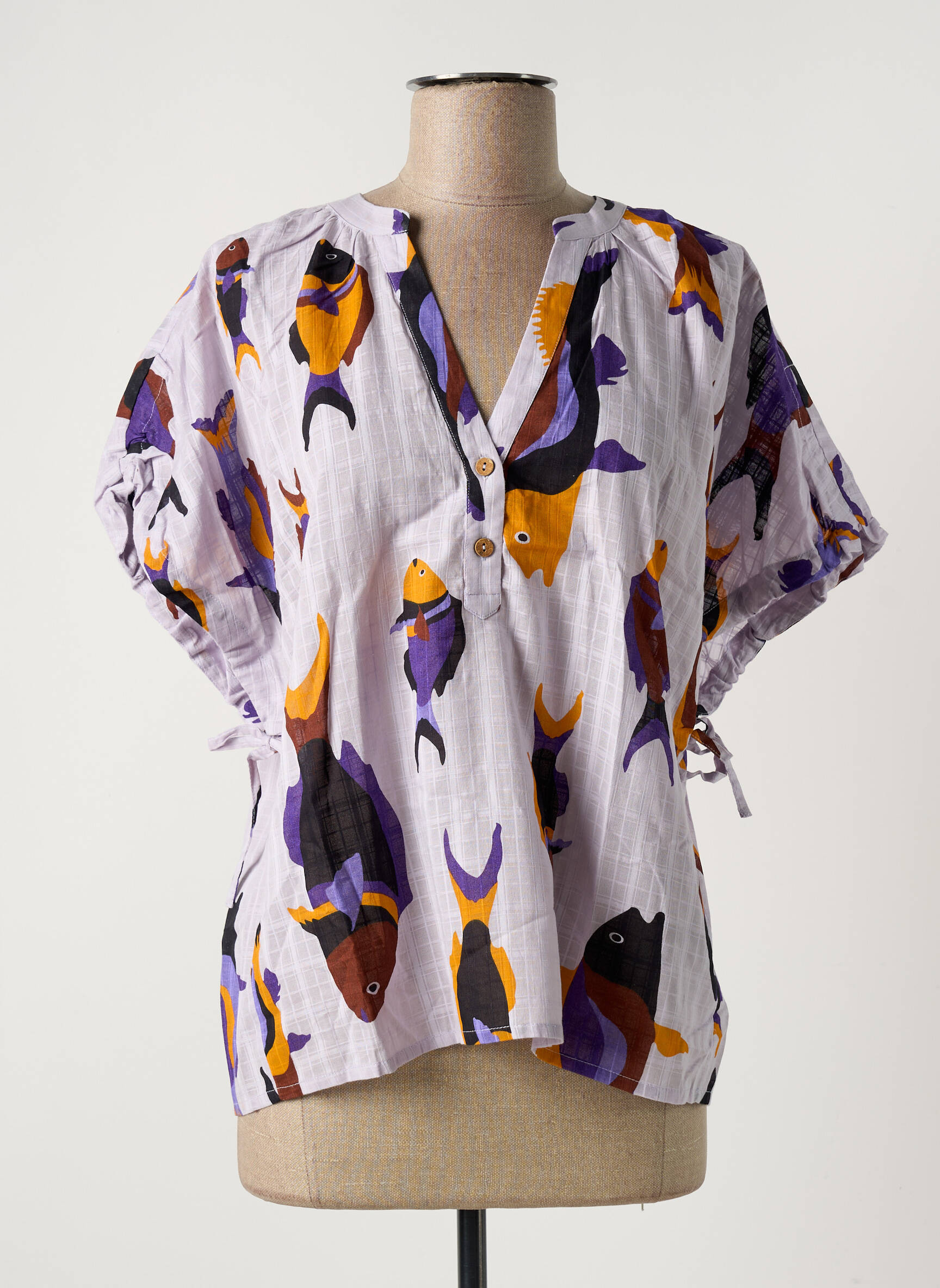 Profitez d’un vrai bon plan mode avec cette blouse originale de la marque NICE THINGS, idéale pour apporter une touche de fraîcheur à petit prix dans votre garde-robe. Son motif coloré représentant des poissons stylisés sur un fond blanc cassé confère à cette pièce un style unique et ludique, tandis que la coupe ample et les manches légèrement resserrées par des liens offrent un confort optimal au quotidien. Les petits boutons sur le devant soulignent le côté décontracté et actuel de cette blouse pleine de peps, parfaite pour un look estival tendance à prix mini.