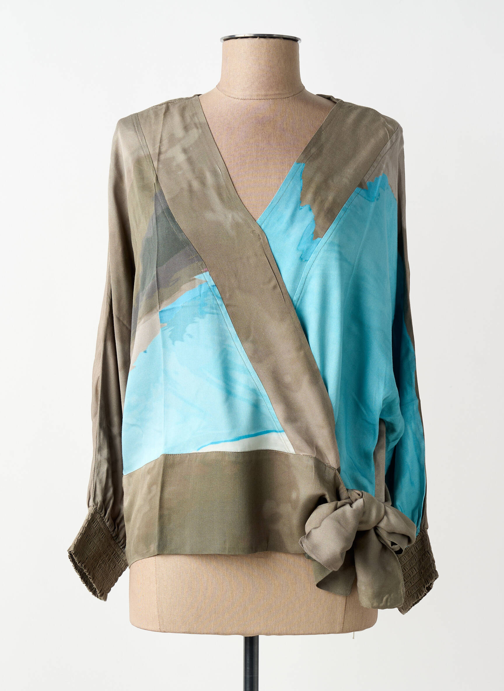 Profitez d’un bon plan avec cette blouse pour femme signée NÜ, qui séduit par son style original et artistique à prix mini. Son effet portefeuille et son large ruban noué sur le côté subliment la silhouette, tandis que les touches de bleu et de beige créent un contraste moderne et raffiné. C’est l’opportunité parfaite pour ajouter à votre garde-robe une pièce unique et élégante sans vous ruiner.