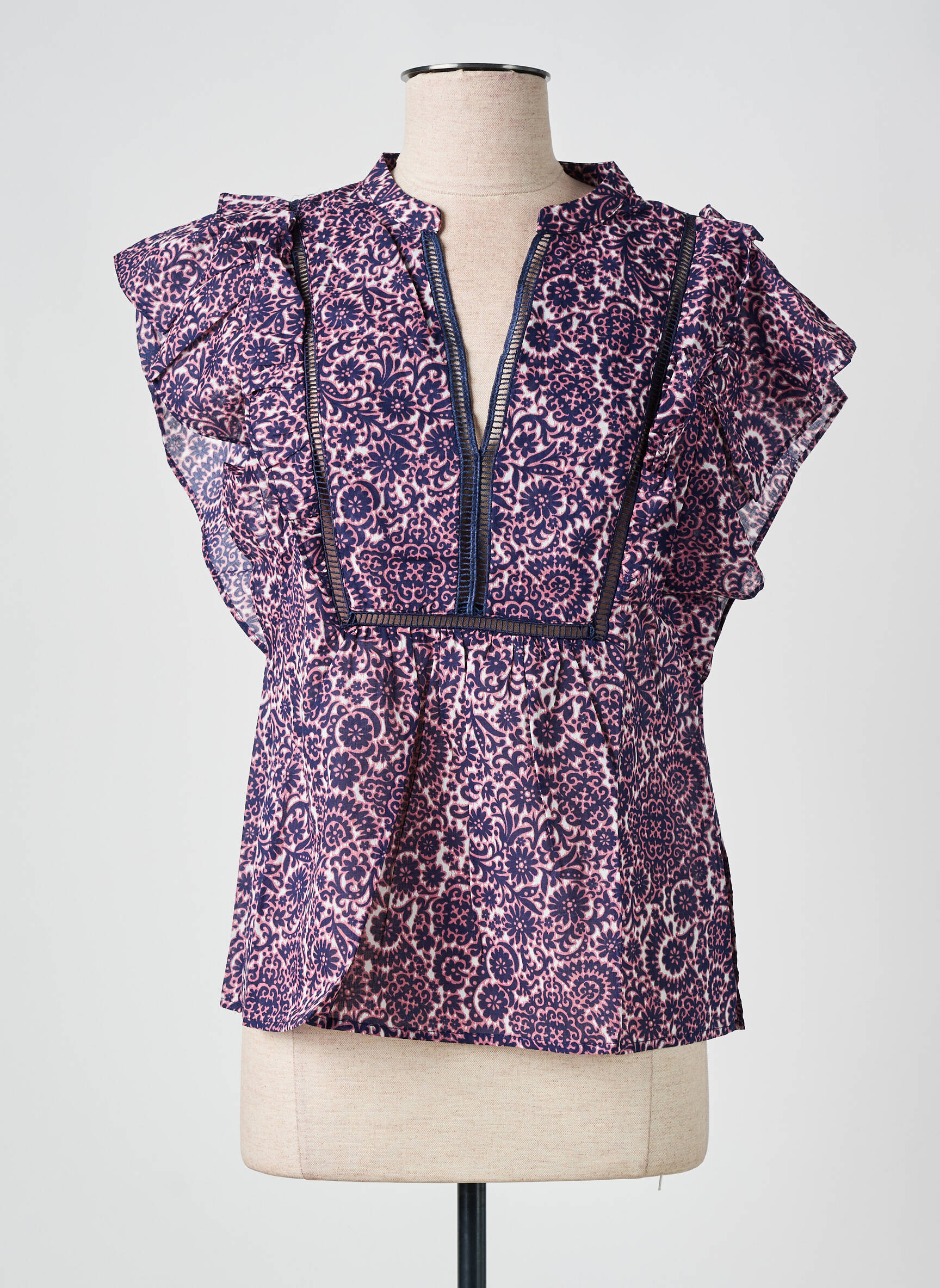 Profitez d’une véritable affaire avec cette blouse ORFEO pour femme, idéale pour égayer votre dressing à prix tout doux. Son imprimé fleuri sophistiqué aux nuances de bleu profond et de rose apporte une touche bohème et élégante, tandis que les volants sur les épaules et l’encolure fendue soulignent délicatement la silhouette. C’est la pièce parfaite pour celles qui recherchent à la fois style et économies, tout en se démarquant avec un modèle original et raffiné.