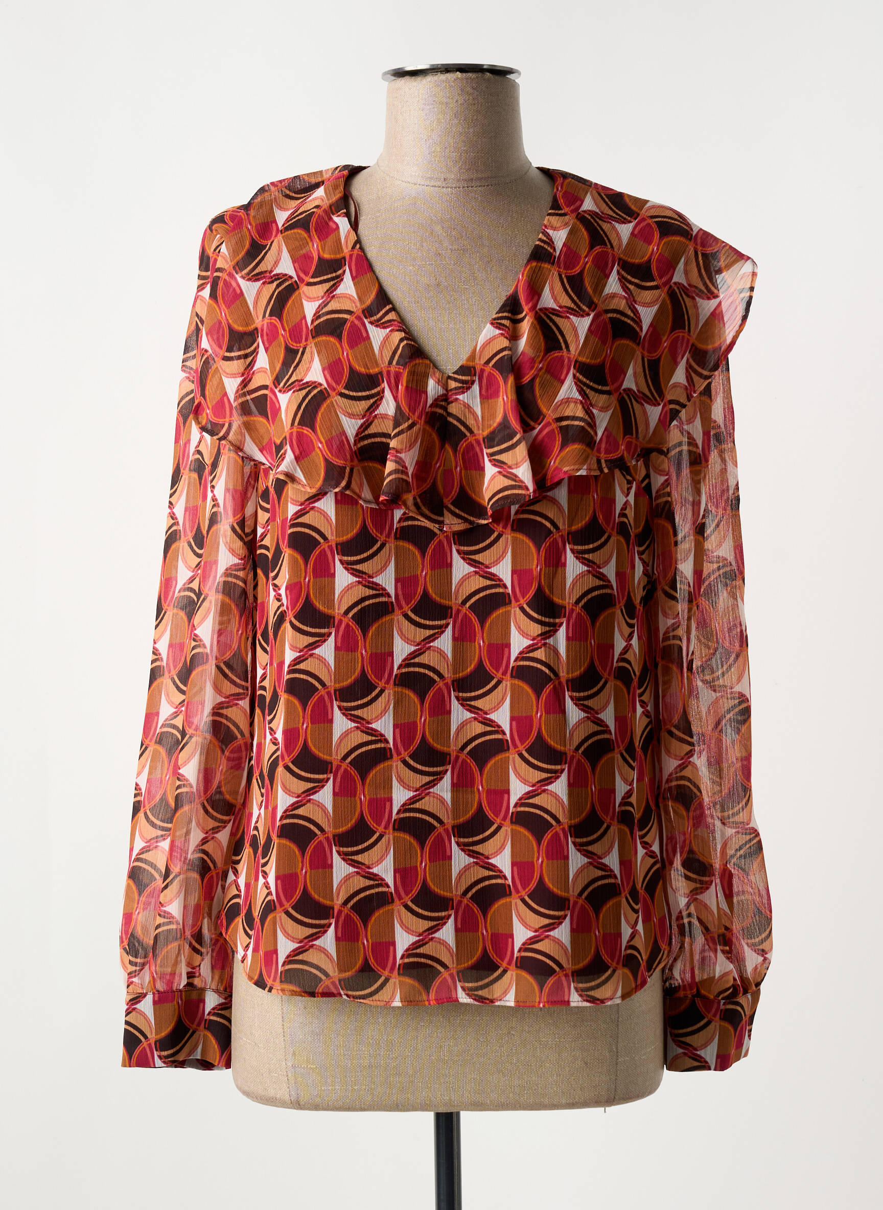 Profitez d’un vrai bon plan avec cette blouse SYMBIOSE pour femme, qui allie petit prix et style tendance grâce à son imprimé géométrique aux tons chauds et rétro. Son décolleté en V délicatement rehaussé par un volant apporte une touche féminine, tandis que les manches longues légèrement transparentes offrent un jeu de matières subtil et élégant, parfait pour dynamiser votre garde-robe sans dépenser trop.