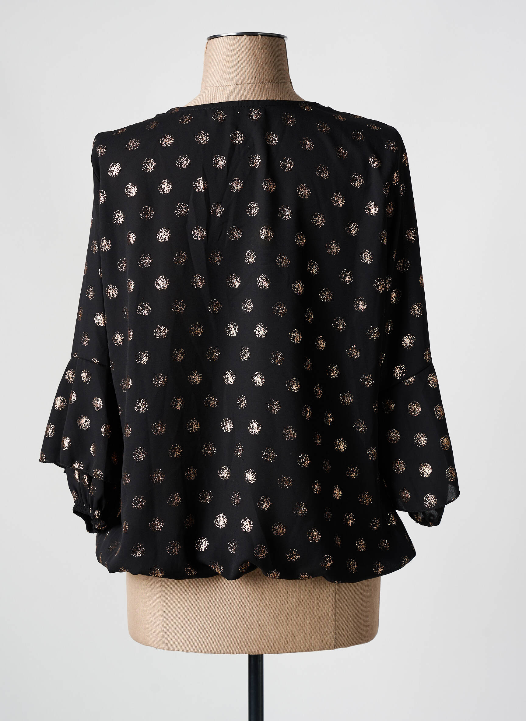 Craquez pour cette blouse TELMAIL à prix mini, une véritable aubaine pour sublimer votre garde-robe sans vous ruiner. Avec son motif délicat de petits pois dorés sur fond noir et sa coupe fluide, elle apporte une touche chic à toutes vos tenues du quotidien. Son encolure en V met en valeur le décolleté tandis que les manches légèrement évasées ajoutent une note féminine et tendance, parfait pour profiter d’un look élégant sans dépenser trop.