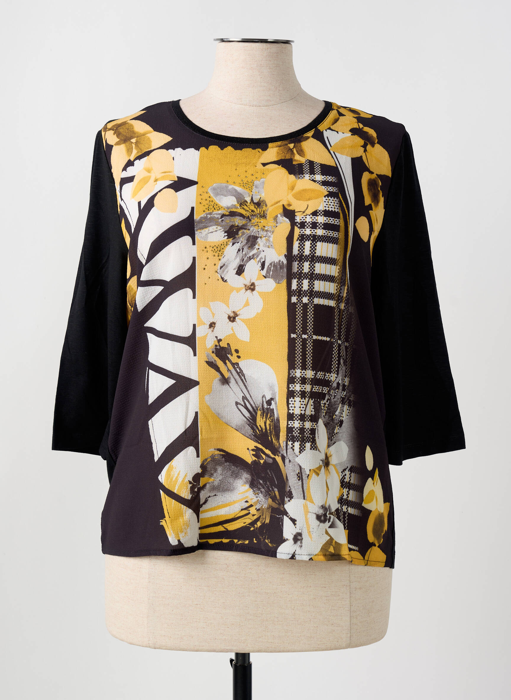 Craquez pour cette blouse THOMAS RABE pour femme, une pièce tendance à prix tout doux qui ne laissera personne indifférent. Son motif mêle subtilement des imprimés floraux et graphiques dans des tons chauds de jaune, de blanc et de noir pour un look moderne et élégant. Les manches trois-quarts noires apportent une touche de contraste et d’originalité, idéale pour dynamiser votre vestiaire à petit prix. C’est le choix parfait pour allier style et économies sans compromis.