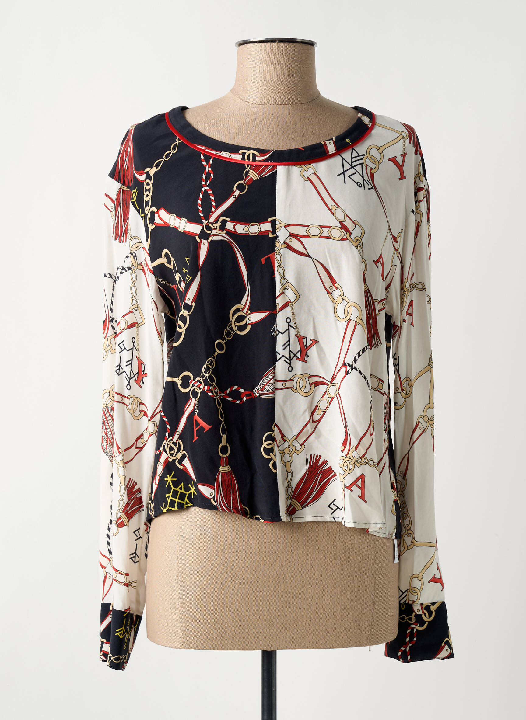 Profitez d'une véritable aubaine avec cette blouse TUZZI pour femme, idéale pour celles qui cherchent à ajouter une touche élégante à leur garde-robe sans se ruiner. Son imprimé chaînes et cordons sur fond bicolore noir et écru offre un look graphique, original et tendance qui attire tous les regards. Grâce à sa coupe légèrement ample et sa finition soignée, cette blouse assure un porté confortable tout en restant très féminine, parfaite pour sublimer vos tenues du quotidien ou apporter une note sophistiquée à un ensemble plus habillé, le tout à un prix irrésistible.