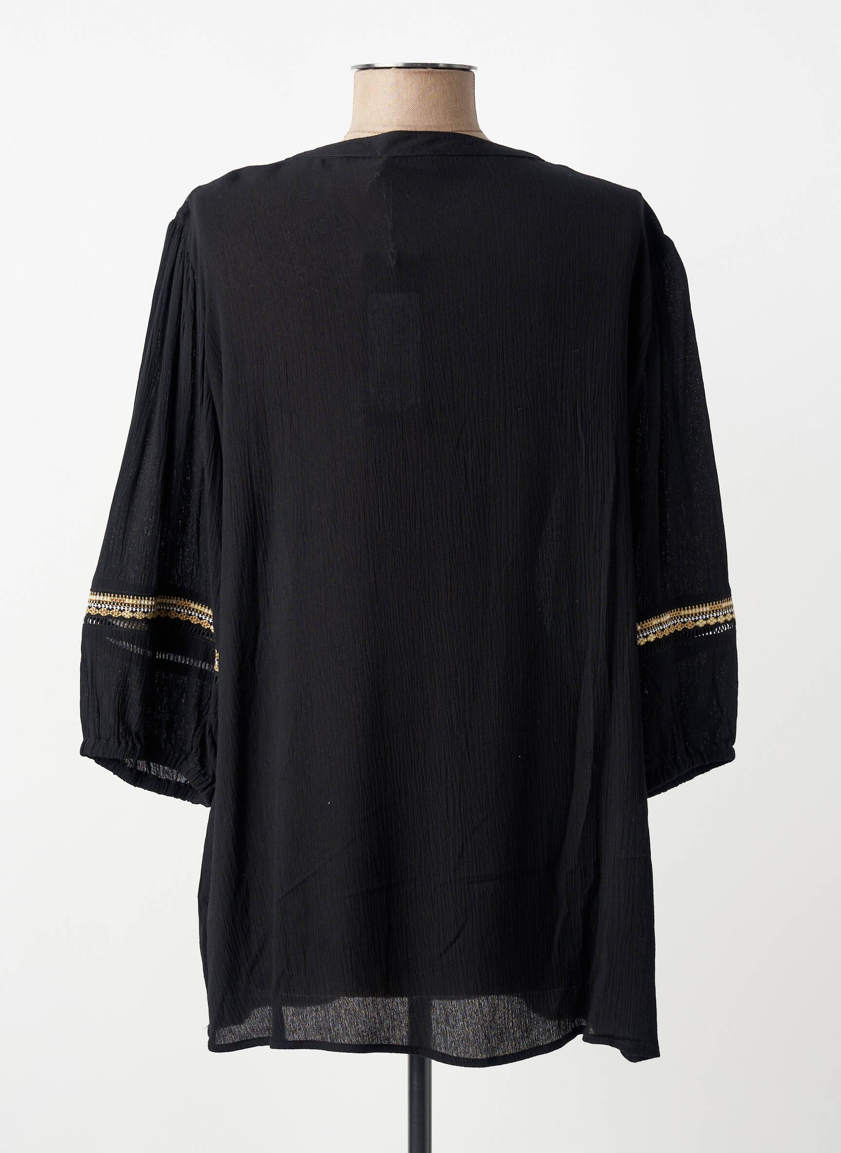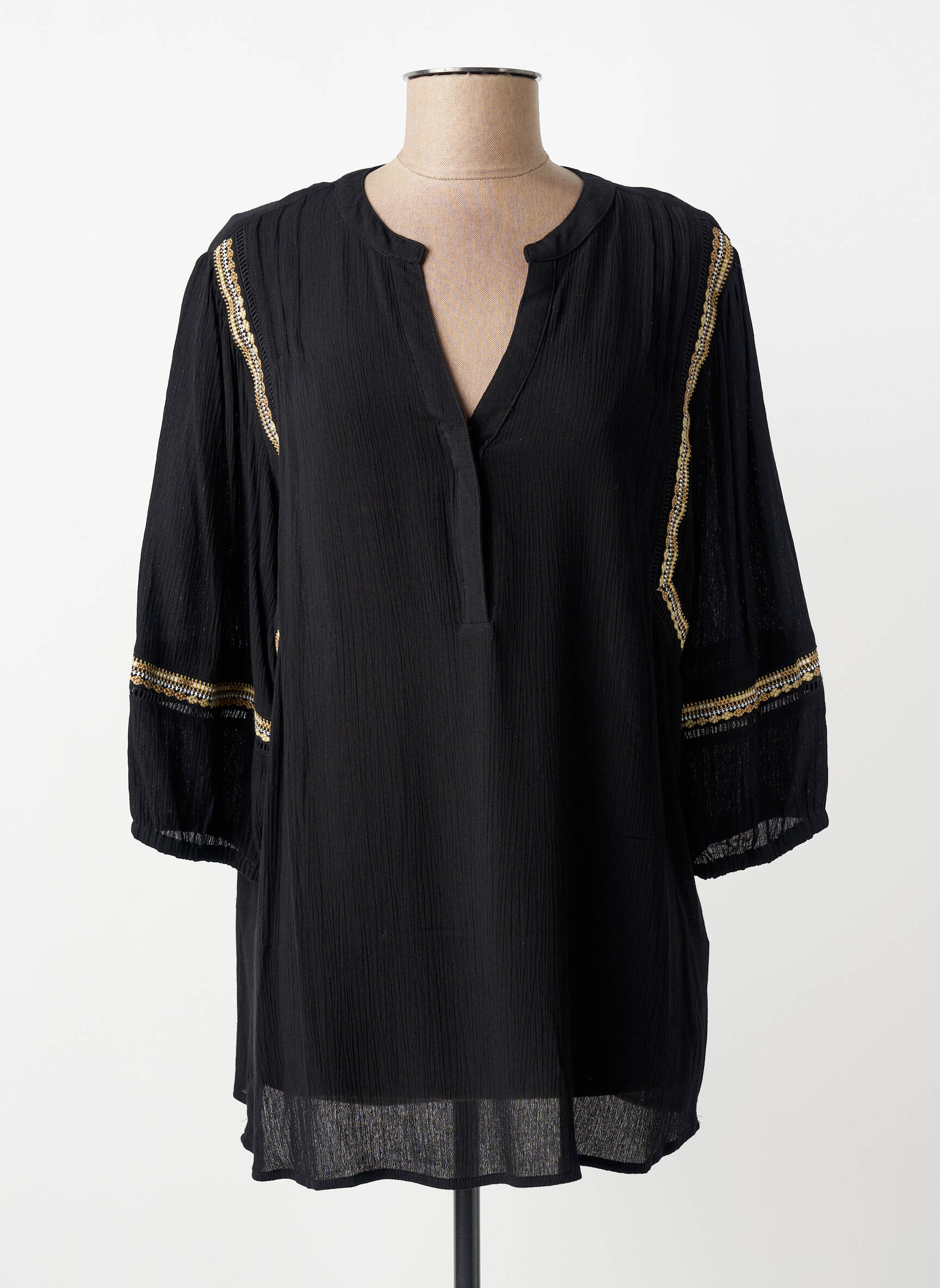 Profitez d'une occasion unique de vous offrir cette blouse YEST à prix mini tout en ajoutant une touche de chic à votre garde-robe. Sa coupe décontractée sublimée par un tissu noir léger, des manches trois-quarts et de délicates bandes dorées sur les épaules et les bras apporte un style élégant et tendance, parfait pour toutes vos envies de looks sophistiqués sans vous ruiner.