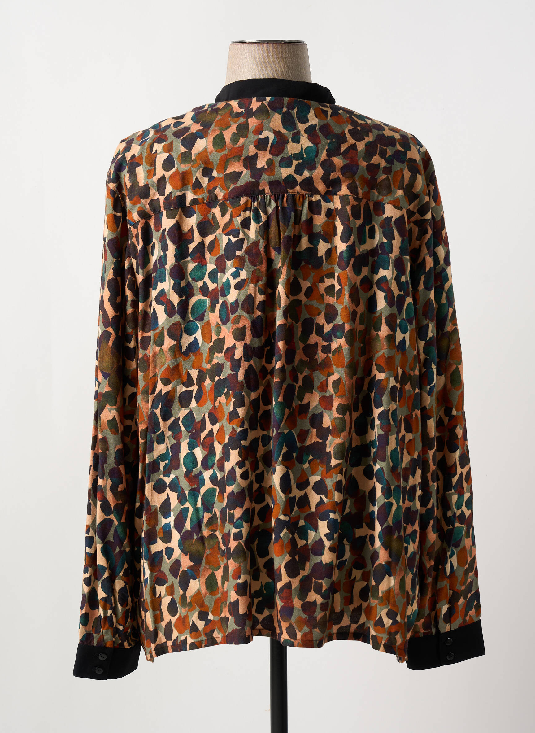 Cette blouse se porte aussi bien rentrée dans un pantalon taille haute que laissée libre sur une jupe crayon pour un effet plus décontracté. Pour un look harmonieux, elle s’associe parfaitement avec des bas unis dans des tons neutres comme le noir ou le beige, qui permettront de mettre en valeur ses motifs sans les écraser. Des accessoires minimalistes, comme des boucles d’oreilles fines ou une ceinture discrète, viendront compléter l’ensemble en toute élégance sans surcharger la tenue.