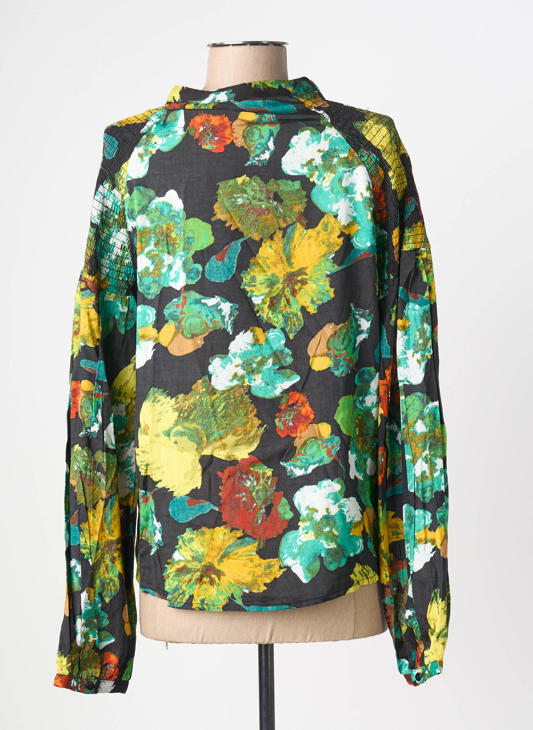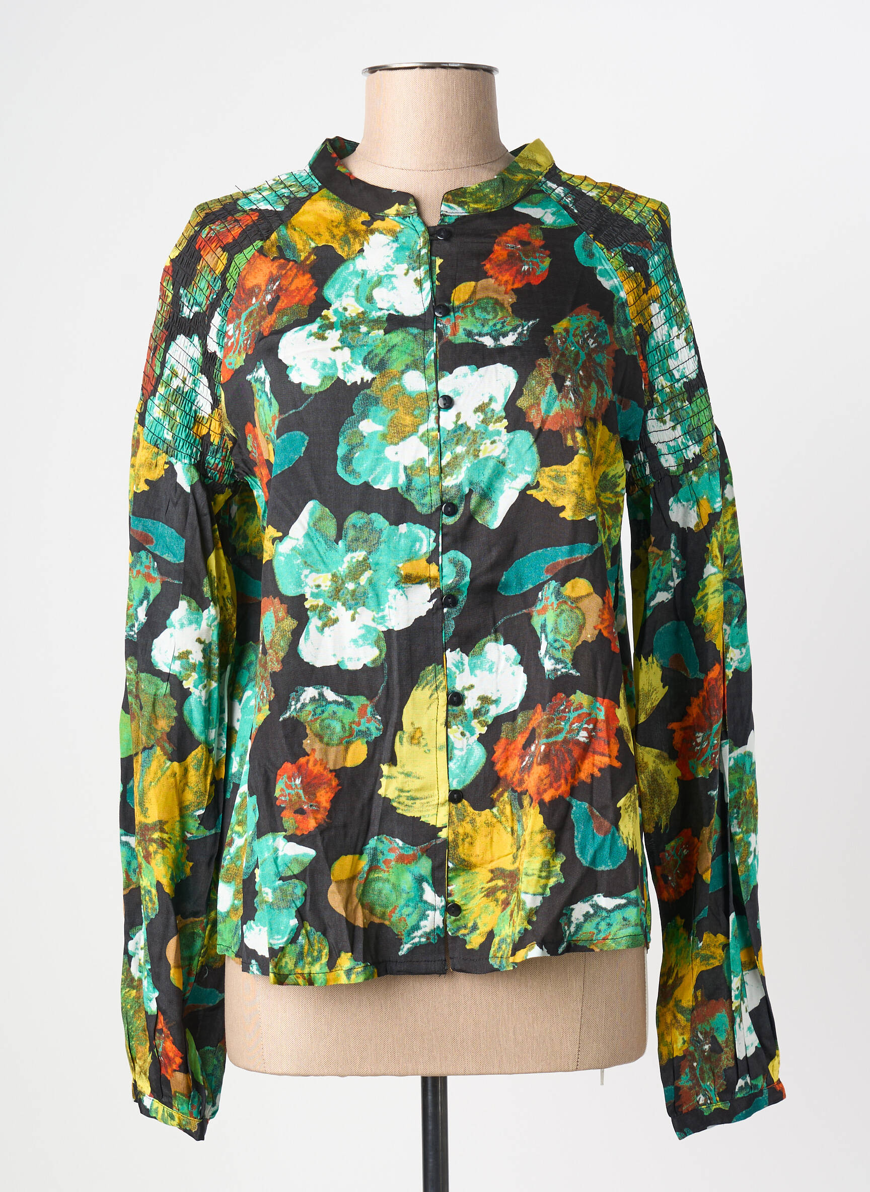 Ce chemisier se porte très facilement avec un jean brut ou un pantalon ajusté pour mettre en valeur son imprimé éclatant, et il s’associe aussi bien avec une jupe midi unie qu’avec un short pour un style plus décontracté. Il peut se glisser sous une veste structurée pour un look urbain ou se porter ouvert sur un haut uni pour une allure plus casual et tendance, accompagné de baskets ou de sandales selon vos envies.