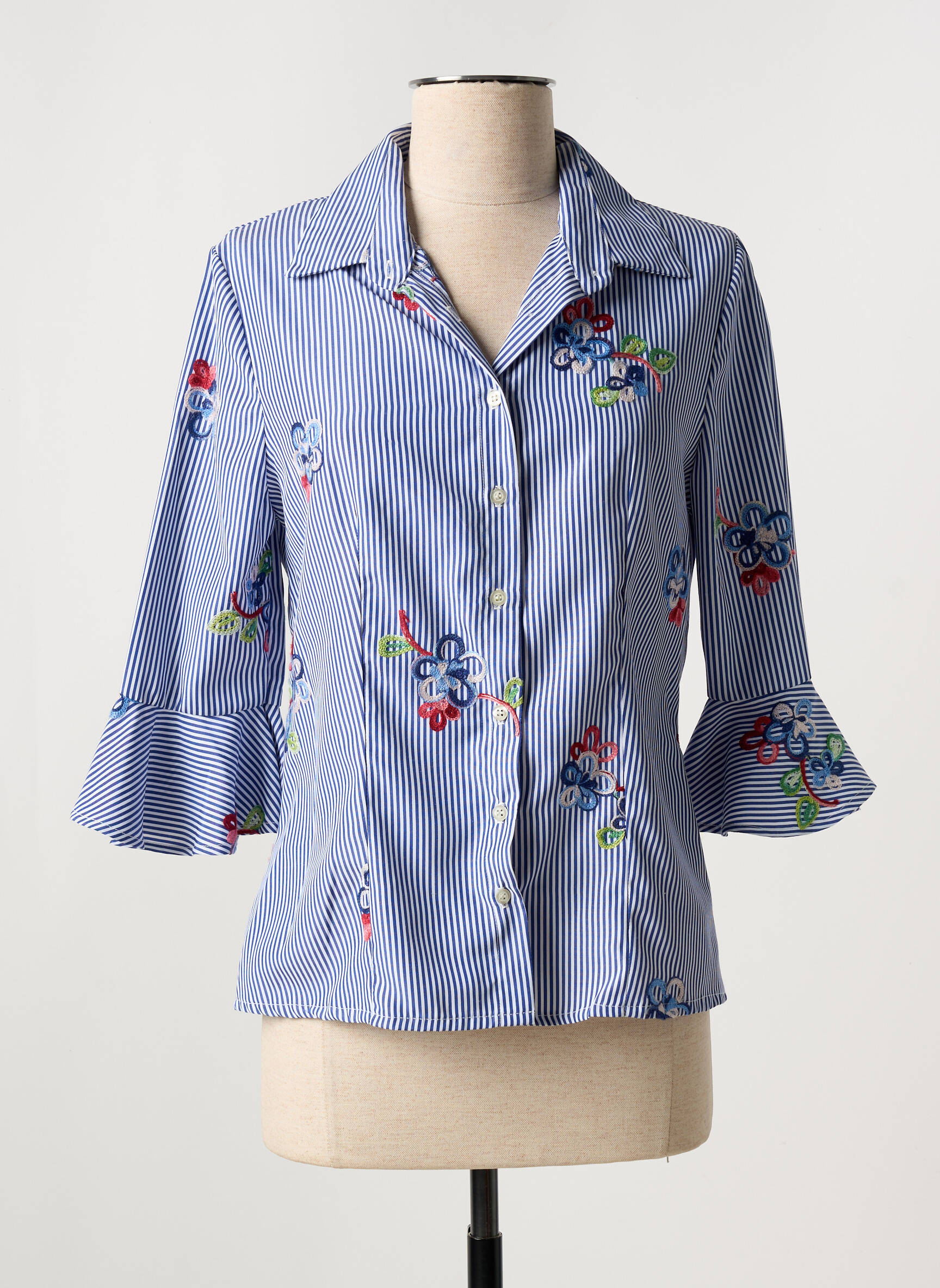 Craquez pour ce chemisier COTTONADE pour femme, une pièce tendance à prix mini qui apporte une touche de fraîcheur à votre garde-robe sans vous ruiner. Son design à fines rayures bleu et blanc est sublimé par des broderies florales colorées, tandis que sa coupe cintrée et ses manches évasées lui donnent une allure élégante et féminine, parfaite pour toutes vos occasions du quotidien ou des sorties habillées, le tout à un excellent rapport qualité-prix.