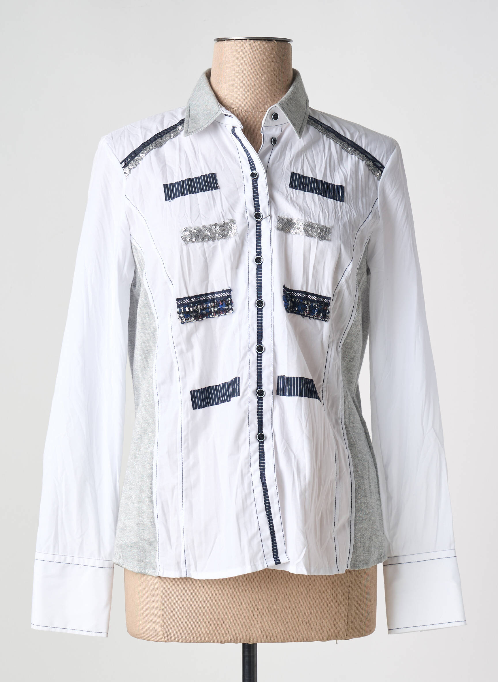 Profitez d’un bon plan mode avec ce chemisier pour femme signé JUST WHITE, à prix réduit, qui associe élégance et originalité grâce à sa coupe structurée et ses détails décoratifs raffinés sur le devant. Ce modèle se distingue par ses empiècements contrastés et ses petits boutons le long de la patte de boutonnage, offrant une allure moderne et sophistiquée. Idéal pour sublimer une tenue de tous les jours ou pour apporter une touche graphique à votre vestiaire sans vous ruiner.