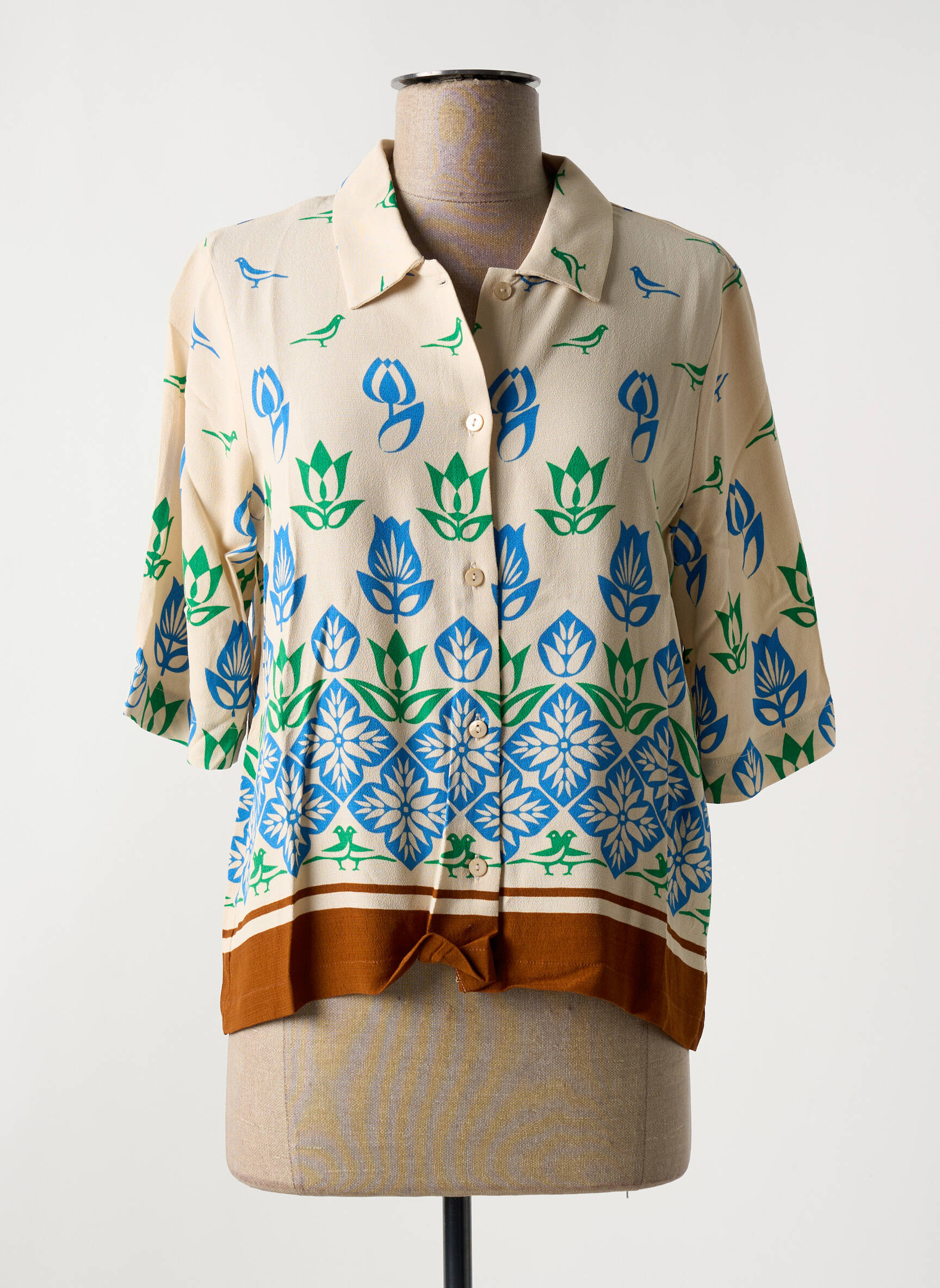 Parfois, les fleurs prennent vie et dansent dans un champ de couleurs, et c'est exactement ce que ce chemisier de la marque NICE THINGS évoque. Avec son ravissant mélange de motifs floraux en vert et bleu sur un fond doux, il apporte une touche de fraîcheur et d'originalité à votre garde-robe. La coupe élégante et légèrement ample assure un confort optimal, tandis que le col classique ajoute une note chic. La finition en dégradé marron à la base confère un charme singulier et parfait pour créer des looks à la fois décontractés et sophistiqués. Ce chemisier est idéal pour les journées ensoleillées comme pour les soirées estivales, où la légèreté et le style se rencontrent harmonieusement.