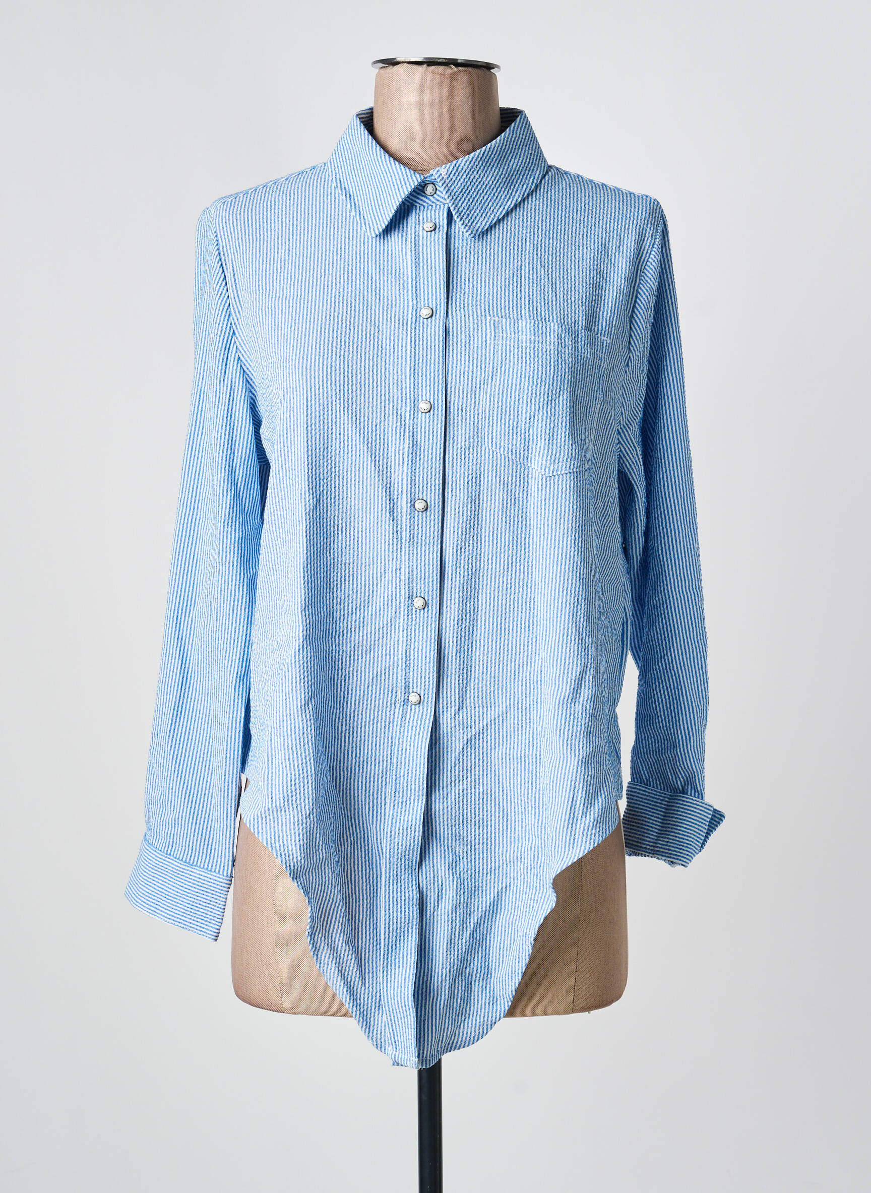 Profitez d’un bon plan exceptionnel avec ce chemisier pour femme signé ONLY qui allie élégance et simplicité, idéal pour compléter votre dressing à petit prix. Sa couleur bleu clair rehaussée de fines rayures verticales apporte une touche de fraîcheur, tandis que sa coupe moderne et son pan asymétrique à l’avant font la différence pour un look tendance. Les boutons délicats et la poche poitrine ajoutent une note pratique sans perdre en style, ce qui en fait une pièce parfaite pour une allure chic au quotidien sans se ruiner.