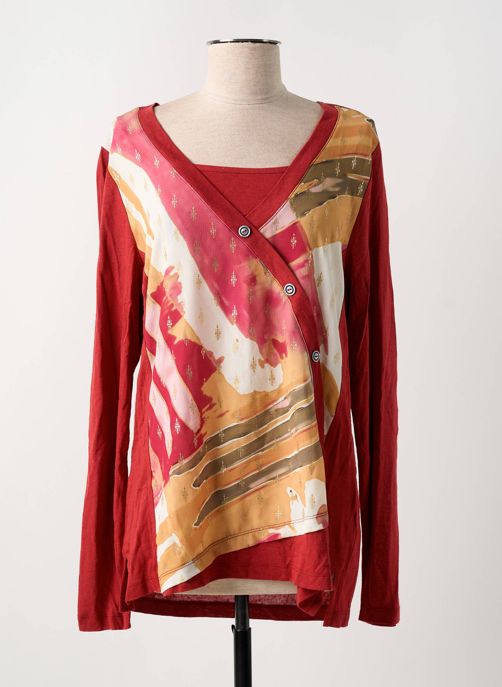 Profitez d'un look tendance à prix tout doux avec ce top pour femme signé BAGORAZ, parfait pour apporter une touche d'originalité à votre garde-robe sans vous ruiner. Son jeu d'imprimés au style artistique dans les tons rouges, crème et ocre, associé à une découpe asymétrique modernisée par deux boutons décoratifs, lui confère une allure unique et pleine de caractère. Ce modèle est idéal pour celles qui aiment se démarquer tout en faisant de bonnes affaires, avec une pièce facile à porter au quotidien et qui apporte instantanément du style à toutes vos tenues.