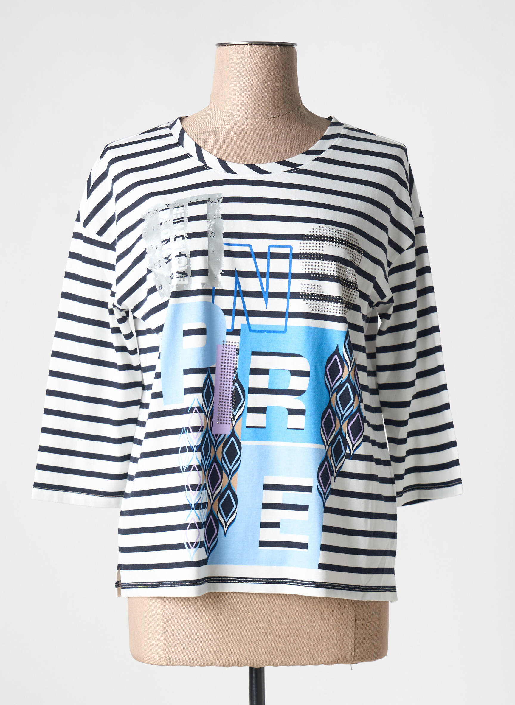 Craquez pour ce top BETTY BARCLAY pour femme, une occasion parfaite de faire des économies tout en ajoutant une pièce tendance à votre garde-robe. Ce modèle joue sur l’originalité avec ses rayures horizontales noires et blanches, rehaussées par un imprimé graphique moderne mêlant bleu clair, motifs géométriques et lettrage tendance. Sa coupe légèrement ample et ses manches 3/4 offrent un style décontracté idéal pour la mi-saison, parfait pour renouveler votre look sans vous ruiner.