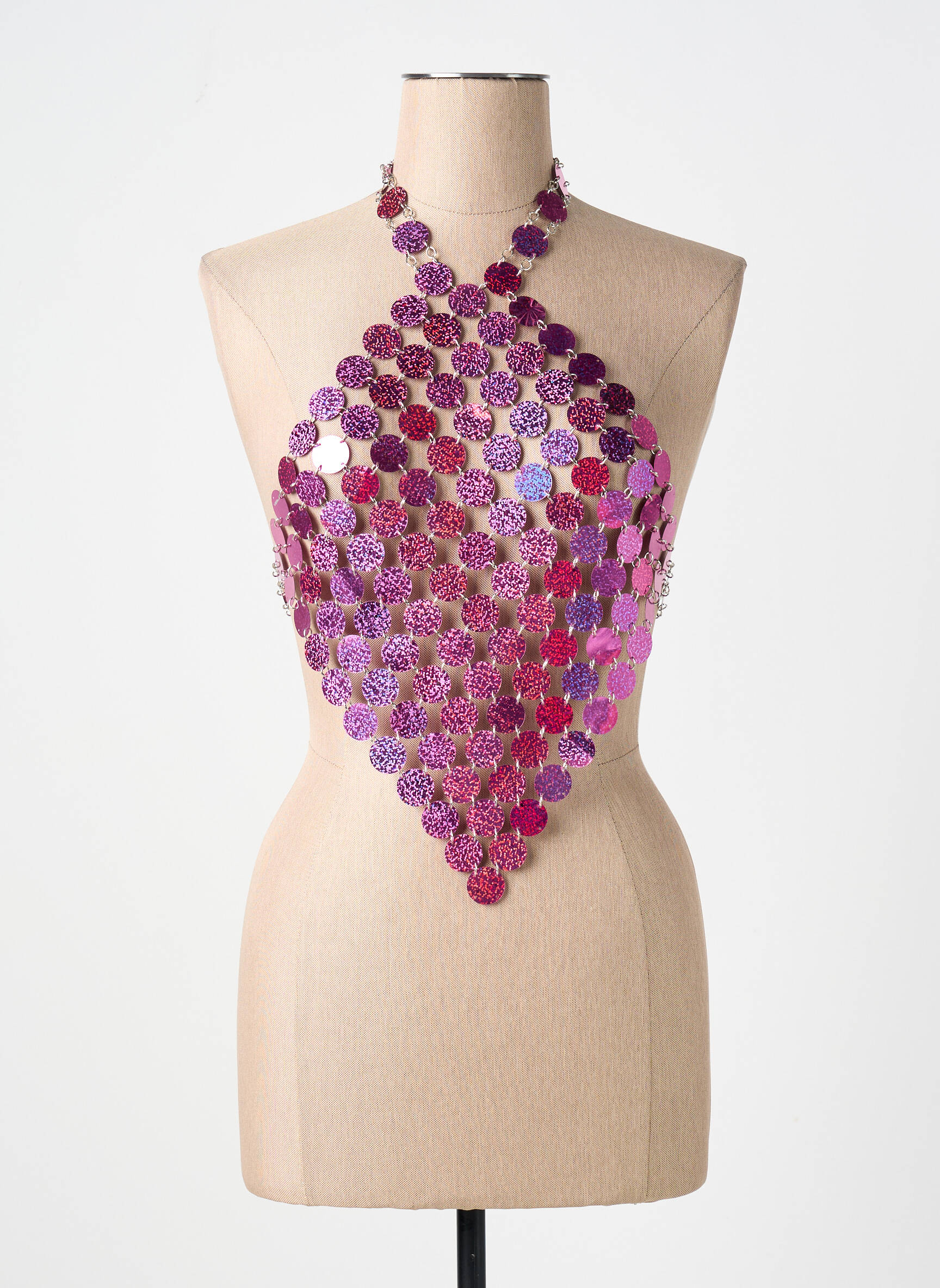 Craquez pour ce top original de la marque BOOHOO et faites des économies tout en adoptant un style résolument unique. Ce haut se distingue par son design audacieux composé de larges sequins ronds déclinés dans des nuances de rose, de violet et de fuchsia, formant une structure géométrique légère et ajourée, parfaite pour briller lors de vos soirées ou festivals. Profitez d’un bon plan incontournable pour sublimer votre look tout en préservant votre budget.