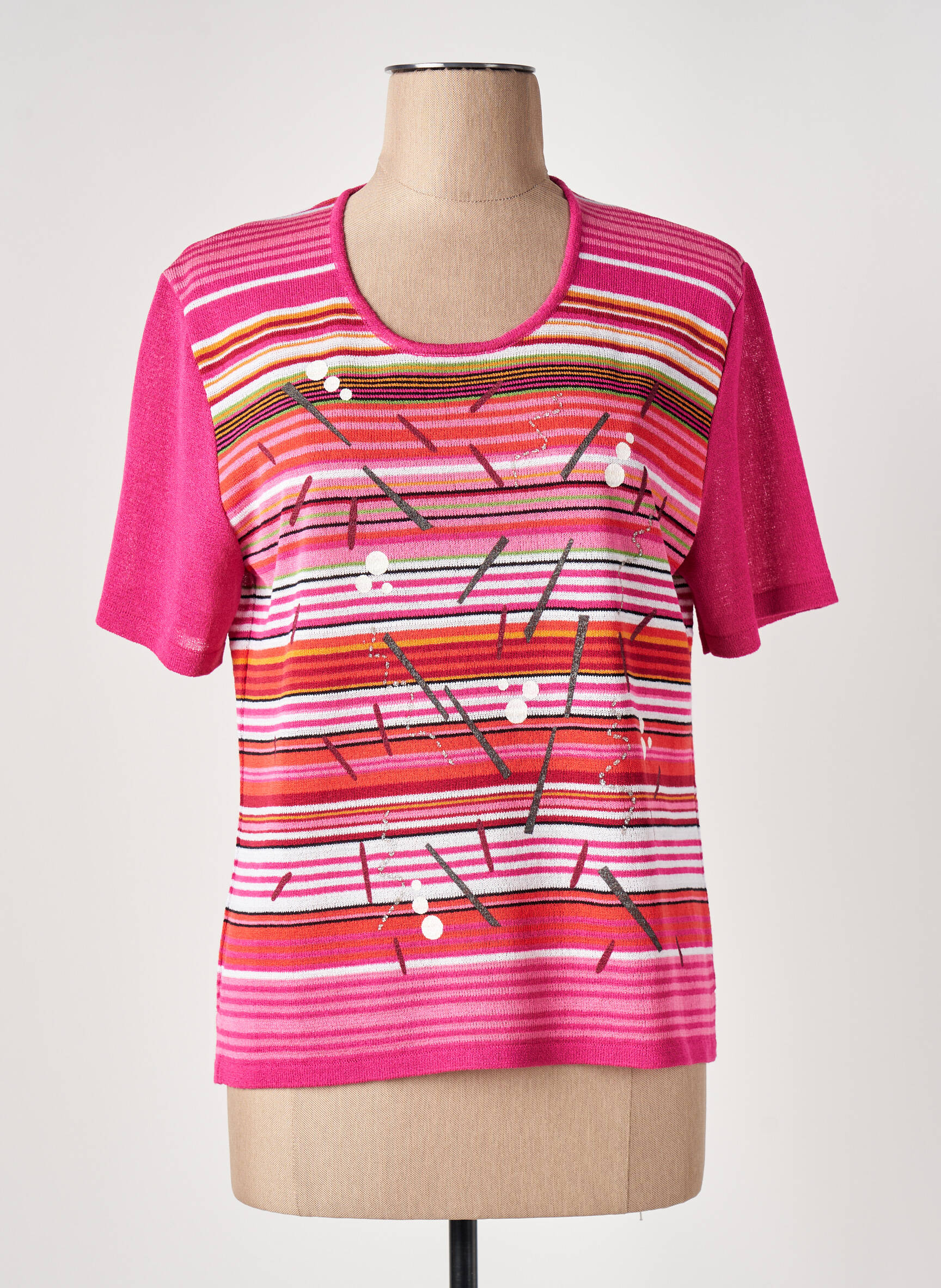 Profitez d’un vrai bon plan avec ce top CHASSAGNARD féminin, proposé à petit prix pour dynamiser votre garde-robe sans compromis. Son imprimé original mêle des rayures roses, rouges et blanches rehaussées de motifs graphiques pour une touche de modernité, tandis que sa coupe à manches courtes et son encolure ronde assurent un confort agréable au quotidien. Ce modèle coloré offre une belle occasion de se faire plaisir avec un look tendance et économique.