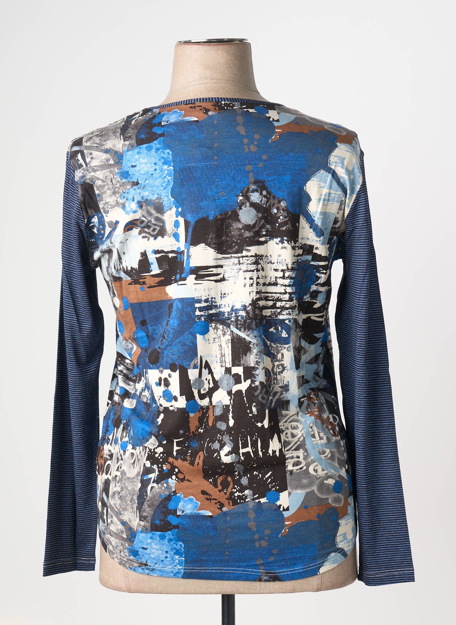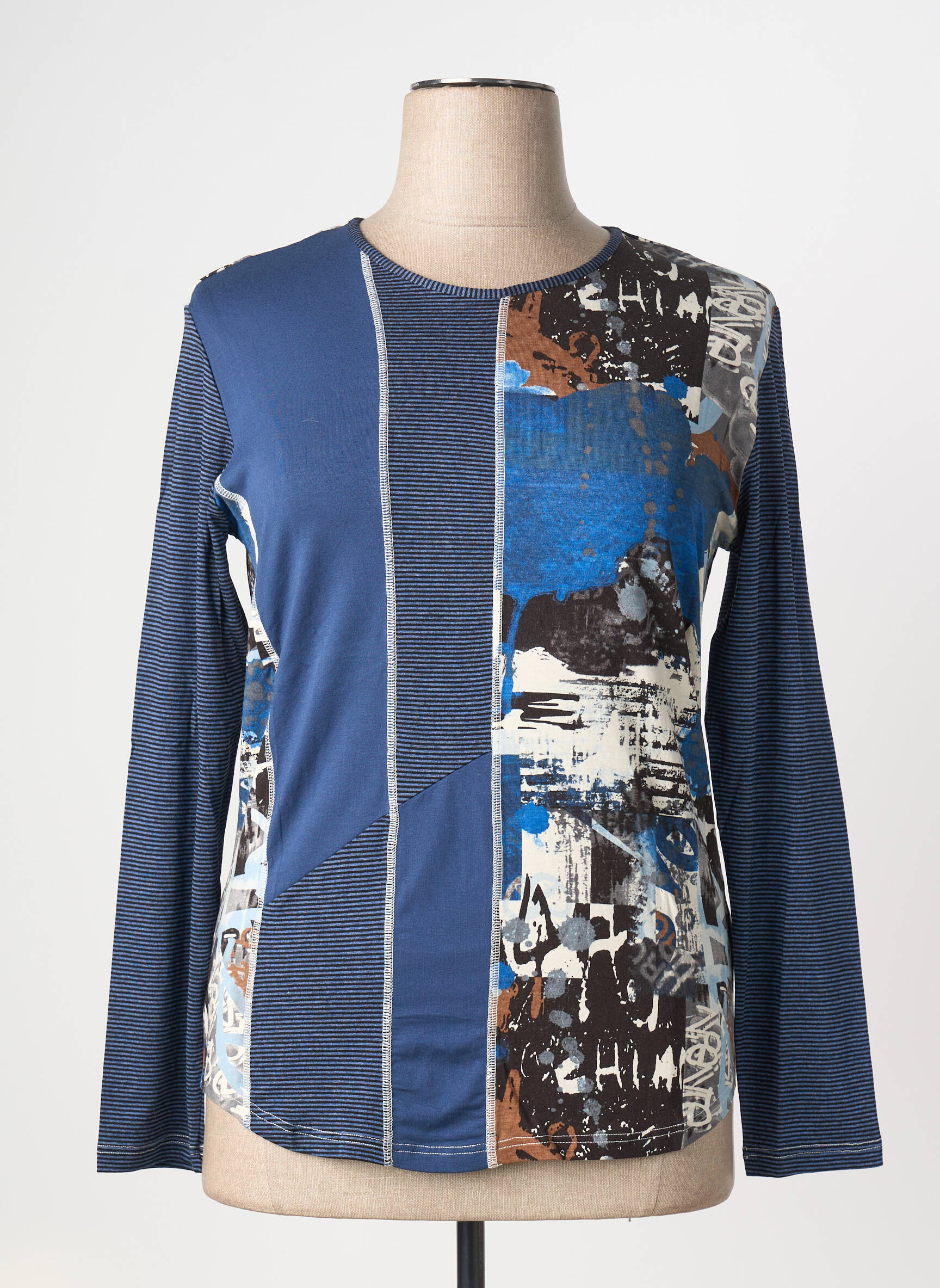 Ce top pour femme de la marque Claude de Saivre est LA bonne affaire à ne pas manquer pour donner du peps à votre dressing sans vous ruiner. Son design original associe des empiècements de bleu profond et des motifs artistiques dans des tons marron, beige et blanc, pour une allure à la fois moderne et unique. Parfait pour celles qui aiment se démarquer à prix mini, ce haut offre un look créateur à petit prix, idéal pour profiter des tendances sans compromis sur le budget.