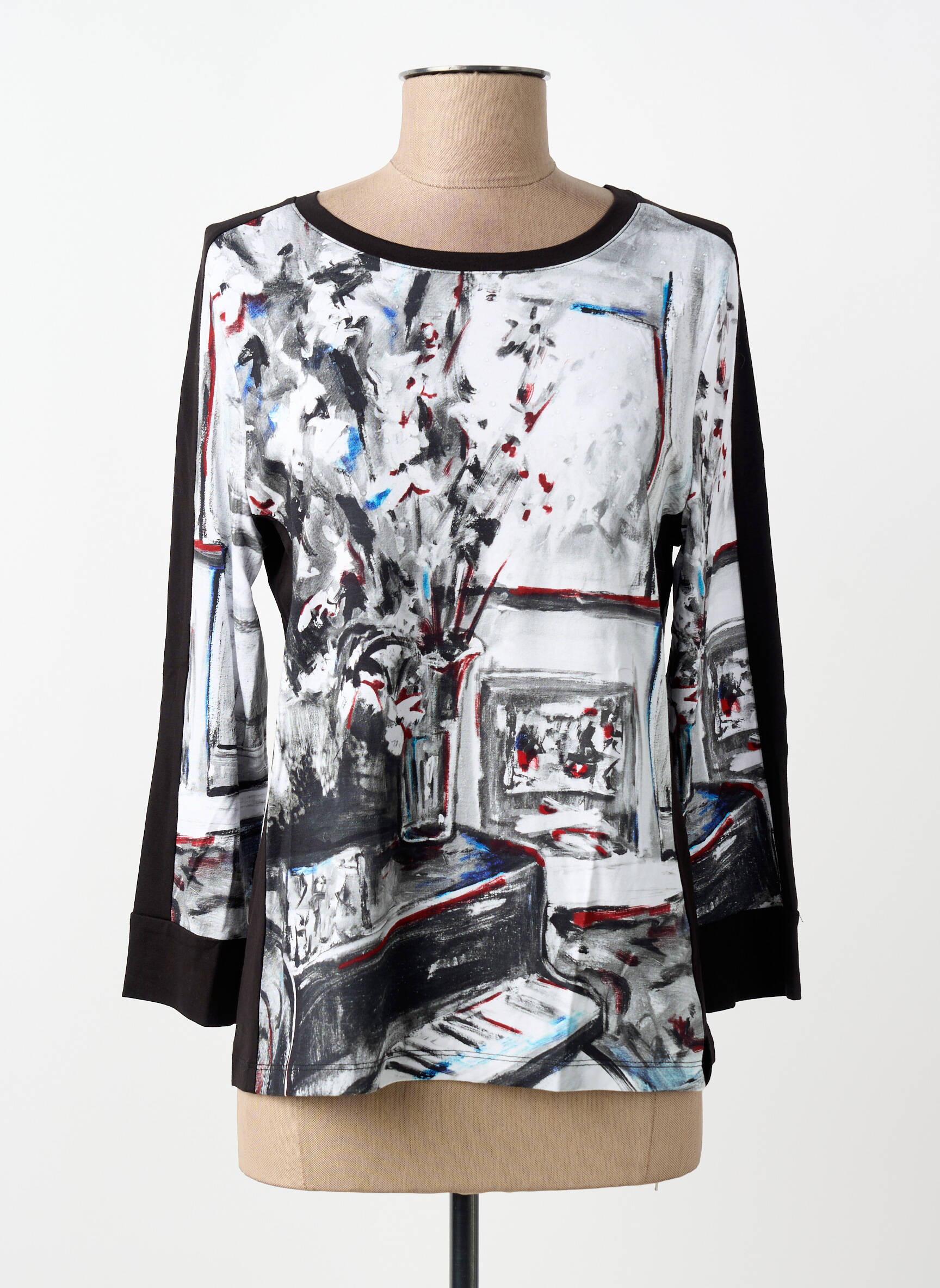 Profitez d’une occasion unique de vous faire plaisir sans vous ruiner avec ce top pour femme signé Dolcezza, une pièce originale à prix tout doux. Son imprimé artistique façon tableau, mêlant des touches de noir, blanc et quelques accents colorés, offre un look raffiné et contemporain. Les manches longues et les côtés unis noir apportent une note d’élégance et de modernité, idéal pour dynamiser votre vestiaire sans sacrifier votre budget.