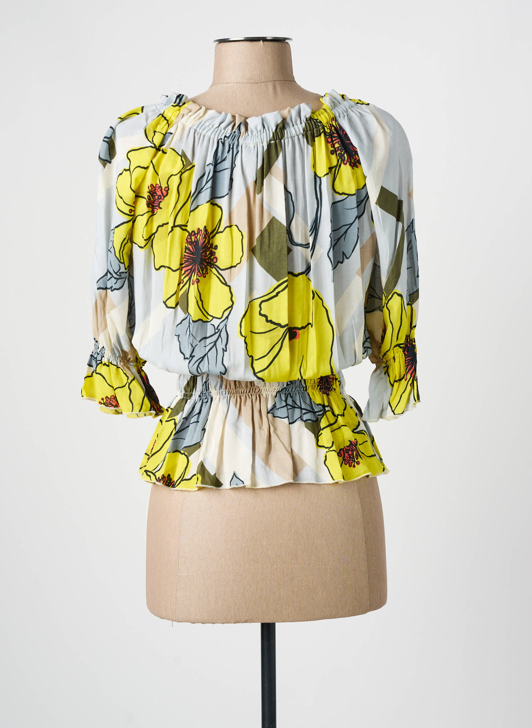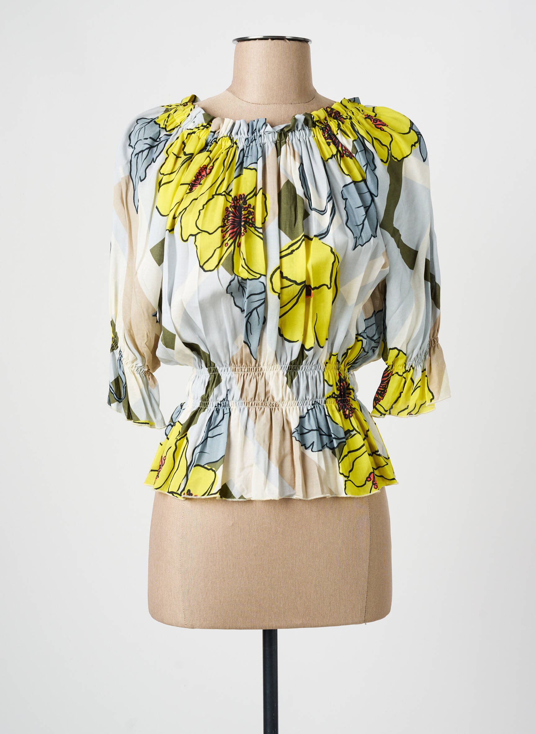 Offrez-vous un look tendance à petit prix avec ce joli top ELEONORA AMADEI pour femme, qui séduit grâce à son imprimé floral jaune lumineux sur fond clair et sa coupe raffinée. Idéal pour dynamiser votre garde-robe sans vous ruiner, ce modèle met en valeur la silhouette avec sa taille smockée et ses manches légèrement bouffantes pour une touche féminine et actuelle. Profitez de cette belle affaire pour ajouter une pièce unique à votre dressing tout en réalisant des économies.