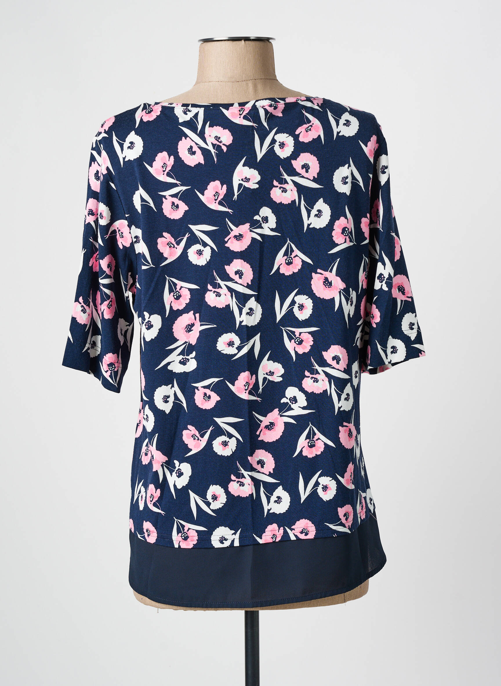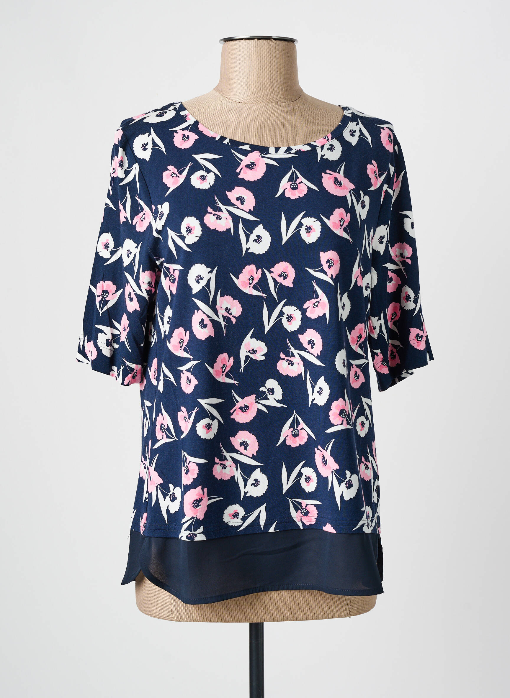 Craquez pour ce top FRANK WALDER à prix mini, une occasion parfaite de vous offrir un look tendance sans vous ruiner. Son imprimé fleuri aux couleurs douces sur fond bleu marine apporte une touche de fraîcheur et de féminité, tandis que la coupe fluide et la base en voile légèrement contrastée assurent un tombé élégant pour toutes vos envies de style.