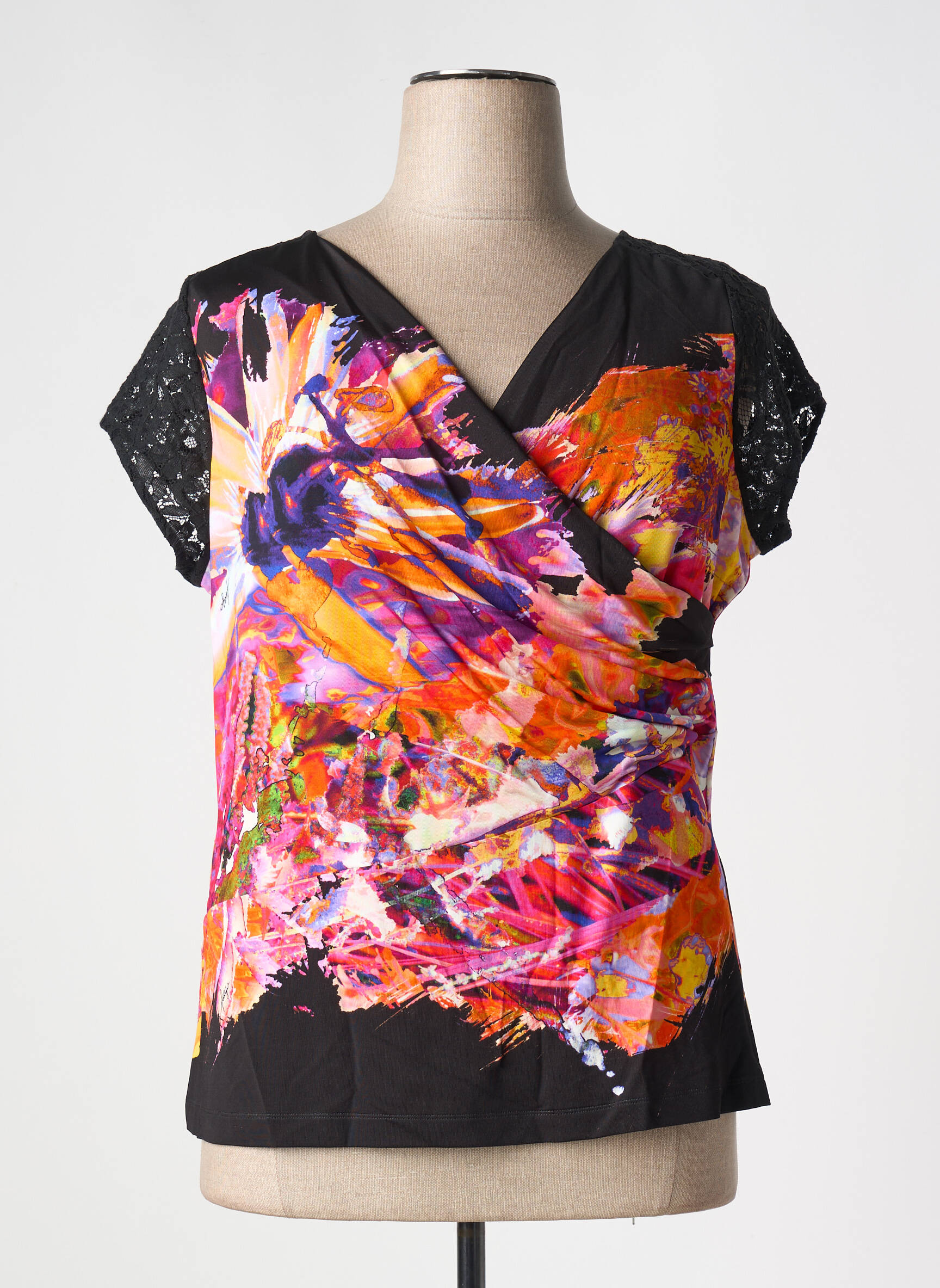 Offrez-vous un coup de pep’s sans vous ruiner avec ce top FUEN JEANS pour femme, parfait pour celles qui aiment miser sur la couleur et l’originalité à prix canon. Son imprimé éclatant mêle des touches de fuchsia, d’orange et de violet pour un effet dynamique, tandis que son encolure cache-cœur et ses petites manches en dentelle noire ajoutent une touche féminine irrésistible. Idéal pour dynamiser votre dressing à petit prix, ce top deviendra rapidement une pièce phare de votre garde-robe, à shopper sans hésiter pour vous faire plaisir sans compromis?!