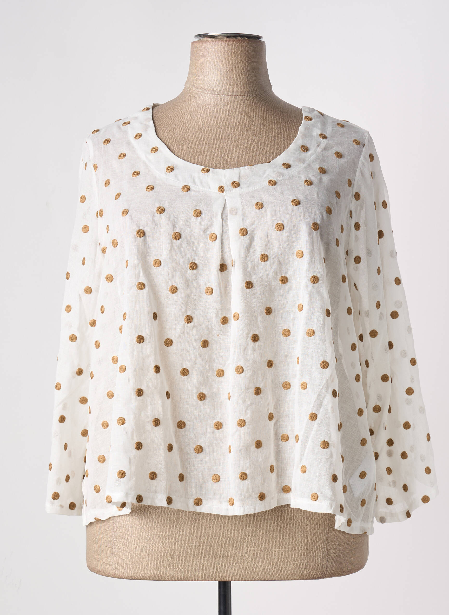 Craquez pour ce top G!OZE pour femme à prix mini, idéal pour ajouter une touche de fraîcheur et d’originalité à votre garde-robe sans vous ruiner. Avec son imprimé à pois dorés sur fond blanc, sa coupe fluide et son encolure ronde délicatement plissée, il offre un look à la fois décontracté et raffiné, parfait pour profiter d’une belle affaire tendance.