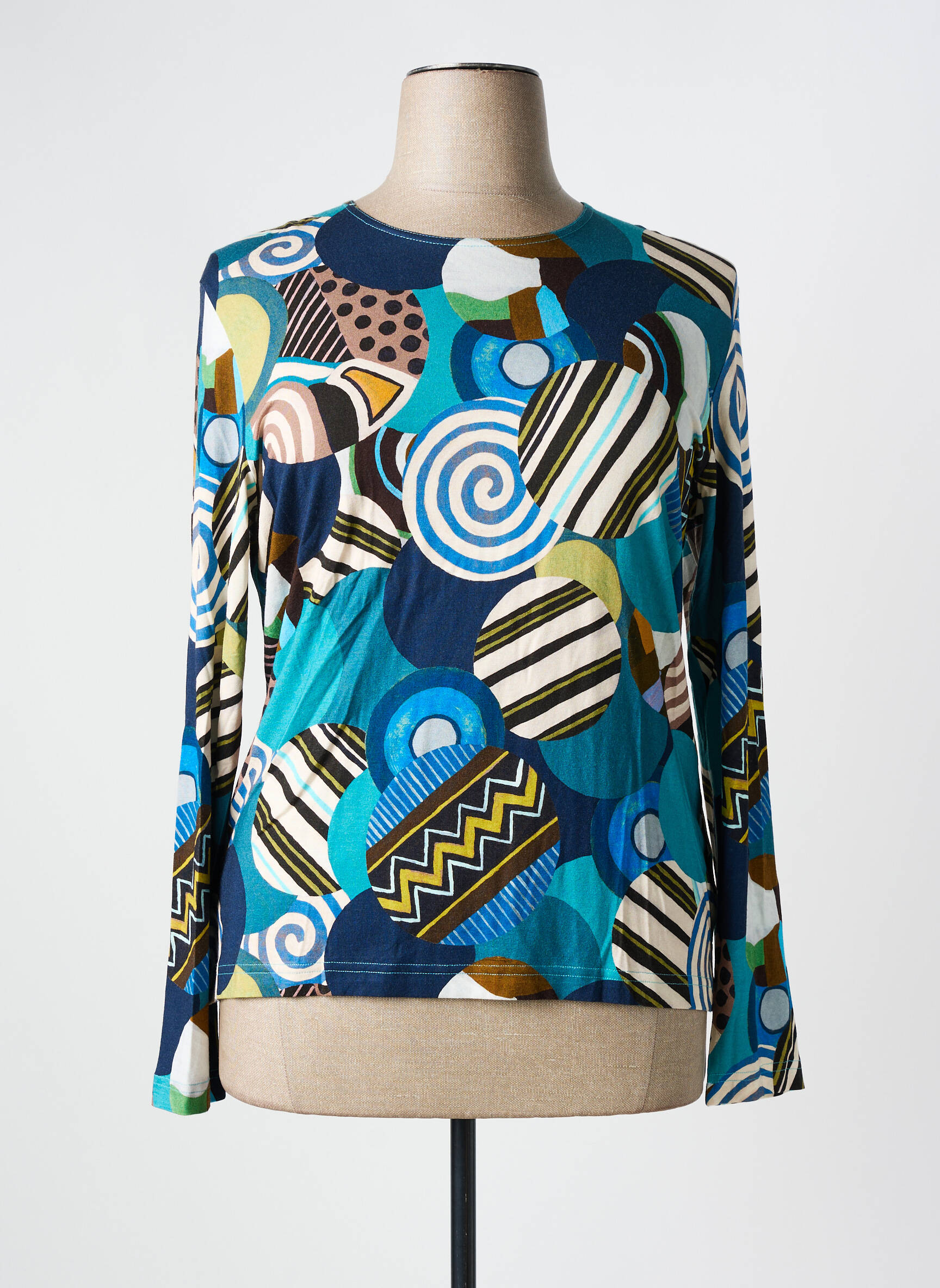 Craquez pour ce top de la marque GRIFFON au motif graphique audacieux, un vrai bon plan qui apporte une touche artistique et dynamique à votre dressing sans vous ruiner. Son imprimé original mêlant spirales, rayures et couleurs bleu, vert et camel saura illuminer vos tenues tout en restant facile à porter au quotidien. Profitez d’une pièce tendance à prix tout doux, idéale pour renouveler votre look sans compromis sur le style.