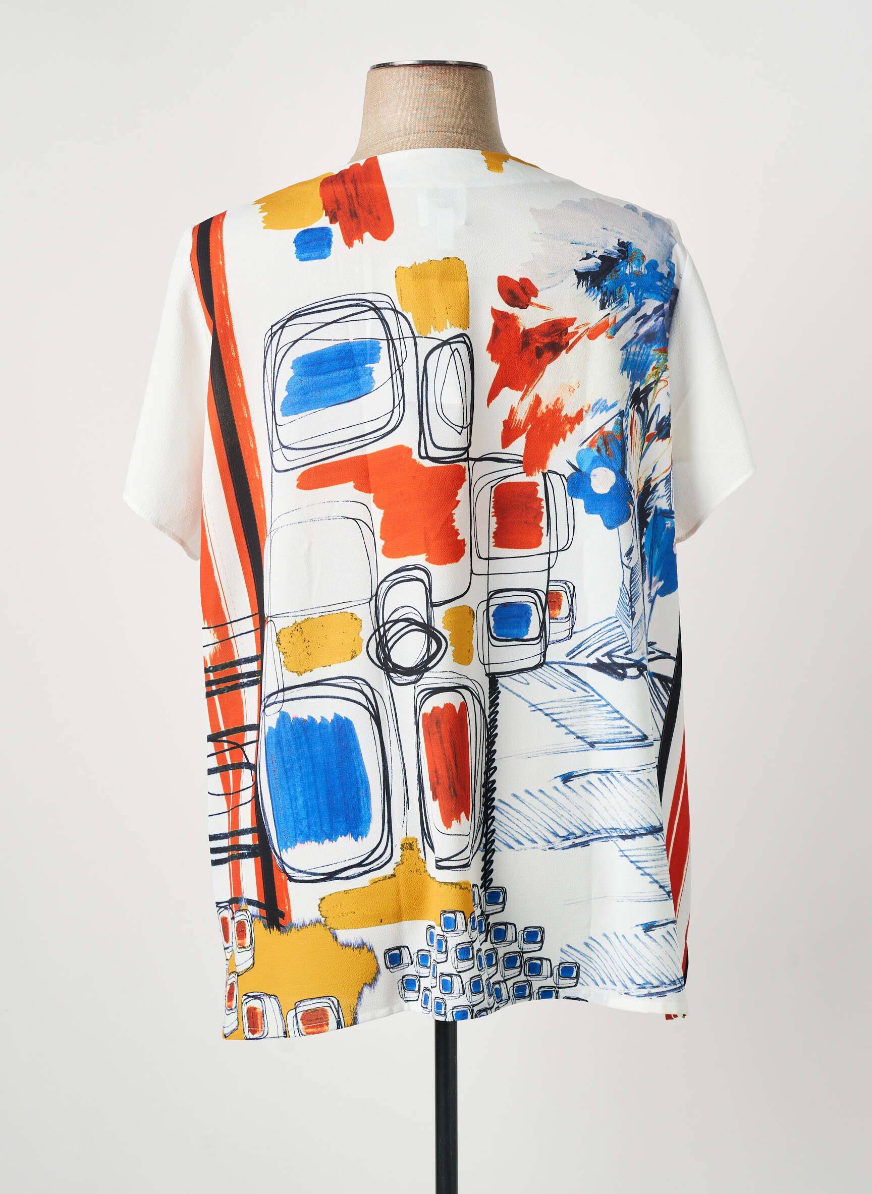 Craquez pour ce top GUY DUBOUIS pour femme, un véritable bon plan pour apporter une touche artistique à votre dressing sans vous ruiner. Avec ses motifs graphiques multicolores qui mêlent des touches de bleu, de rouge, de jaune et de noir sur fond clair, ce haut à manches courtes séduit par son style original et sa légèreté, idéal pour dynamiser vos tenues quotidiennes à petit prix.