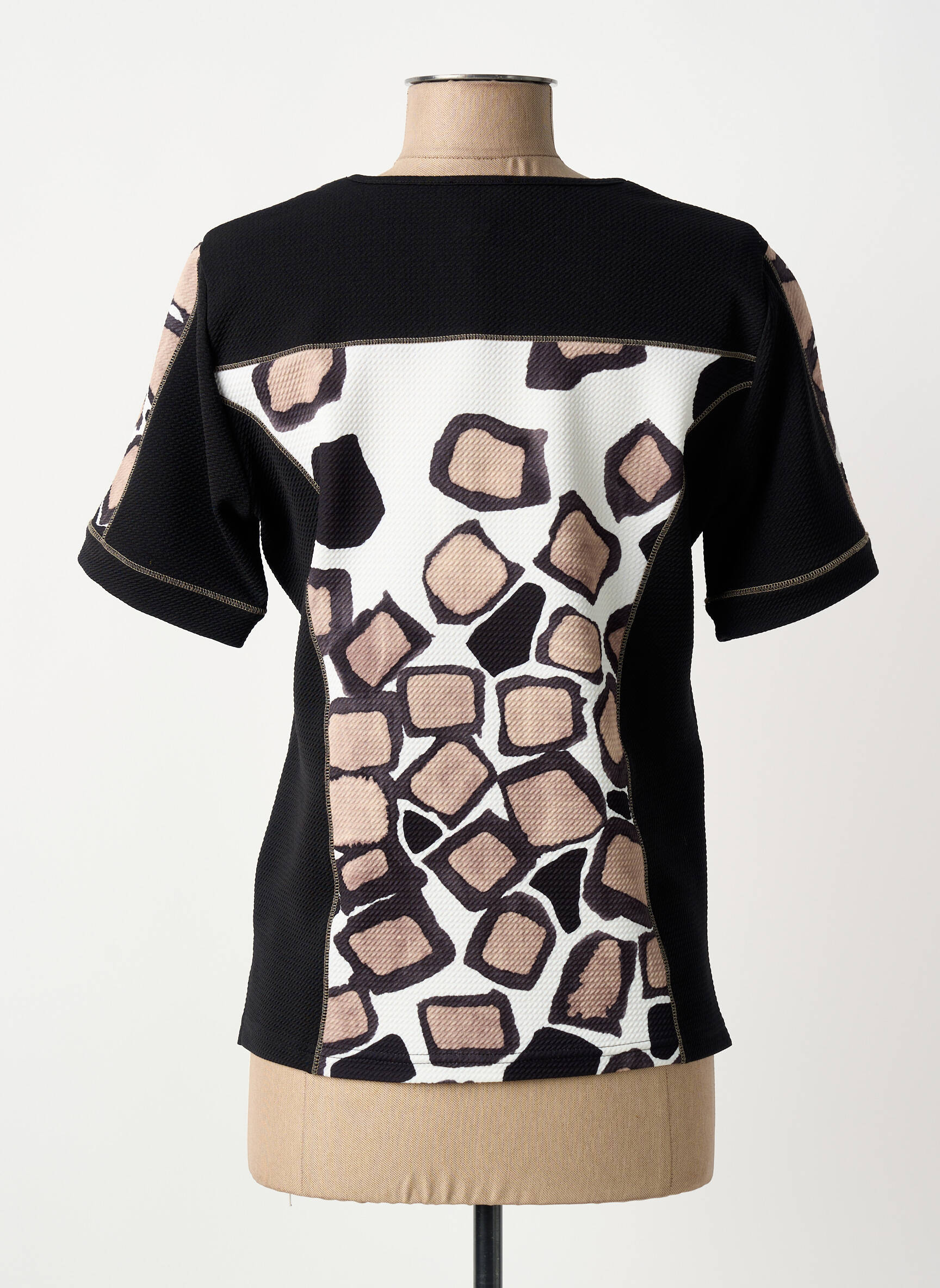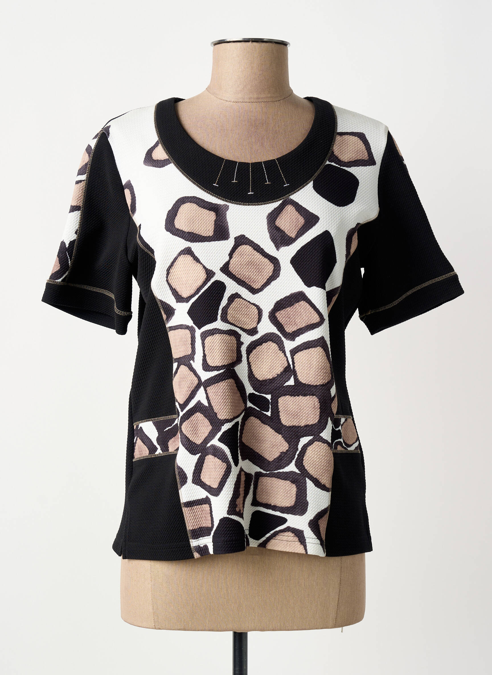 Craquez pour ce top GUY DUBOUIS pour femme, une pièce originale à prix mini qui dynamisera votre garde-robe sans vider votre porte-monnaie. Son motif graphique aux nuances de beige, noir et blanc s’associe facilement à vos tenues du quotidien, tandis que l’encolure arrondie légèrement travaillée ajoute une touche de raffinement. Idéal pour se faire plaisir ou renouveler son look à petit prix, ce top élégant offre un bon plan mode à ne pas laisser passer.