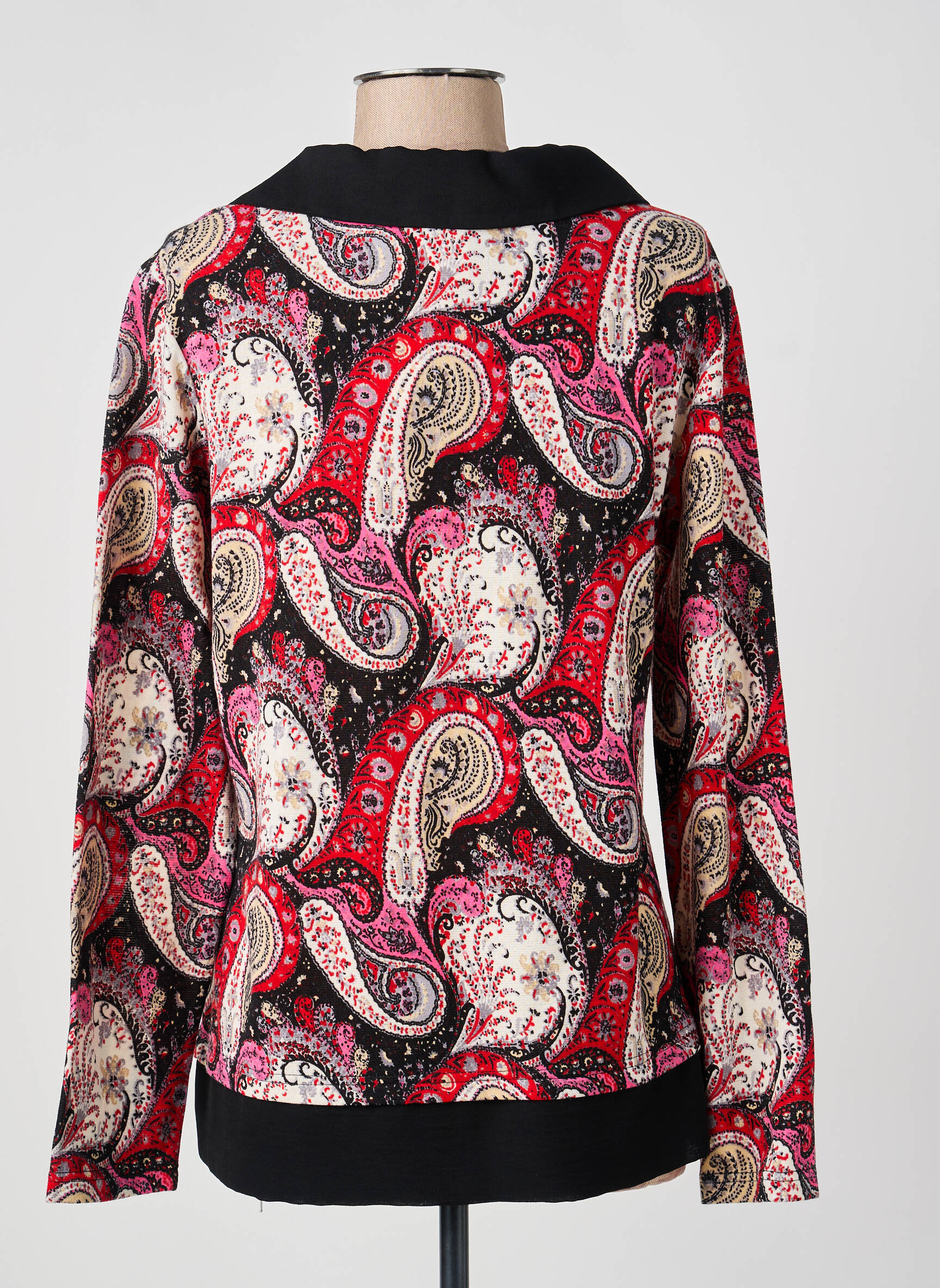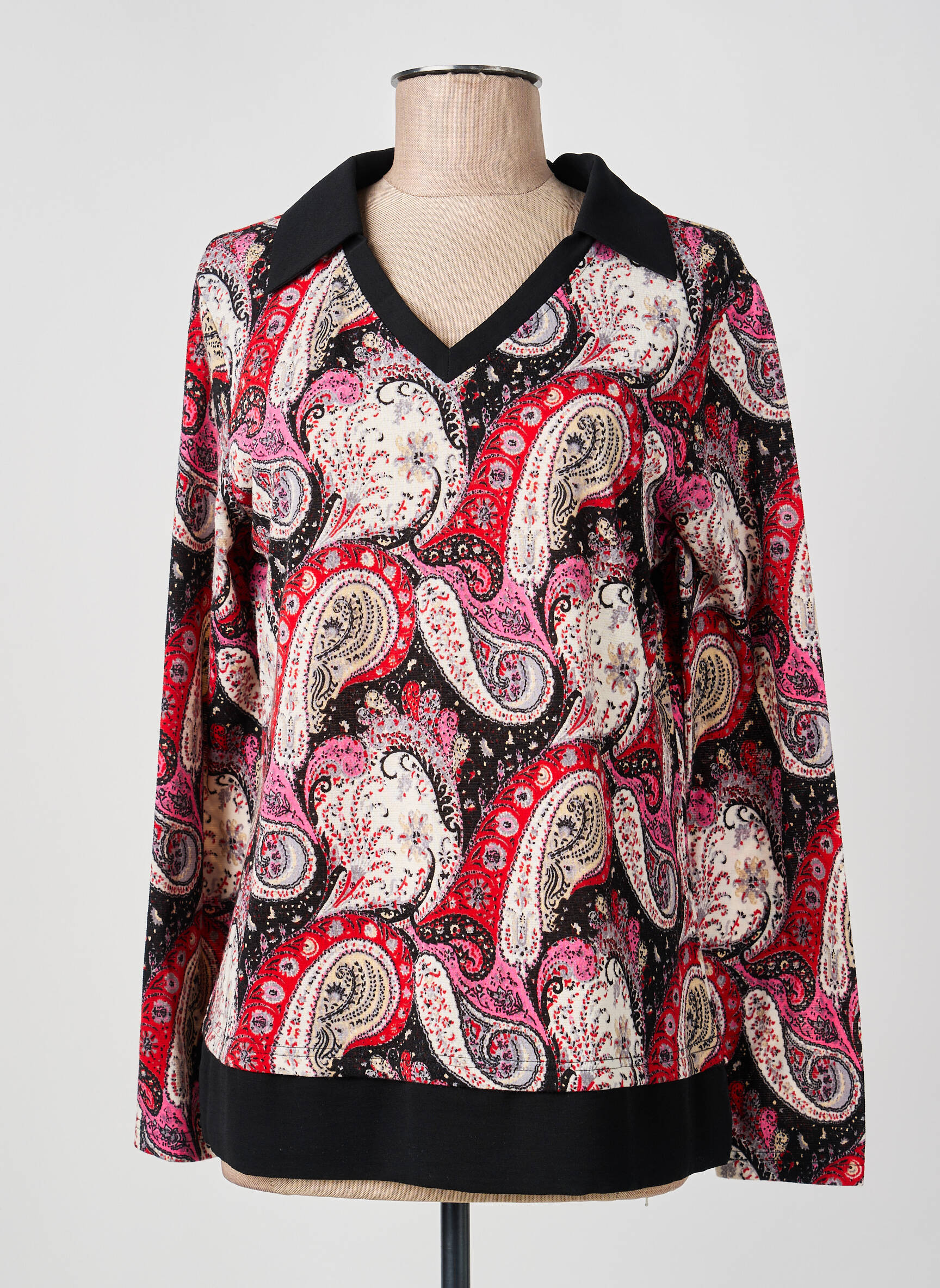 Profitez d’un bon plan avec ce top femme de la marque GUY DUBOUIS, à petit prix pour un style unique et élégant sans se ruiner. Son motif cachemire revisité dans des tons rouges, roses et noirs apporte une touche de caractère et d’originalité à votre tenue, tandis que le col contrasté noir et la finition impeccable lui confèrent une allure raffinée à moindre coût. Idéal pour se faire plaisir sans compromettre son budget, ce top tendance sublime votre quotidien.