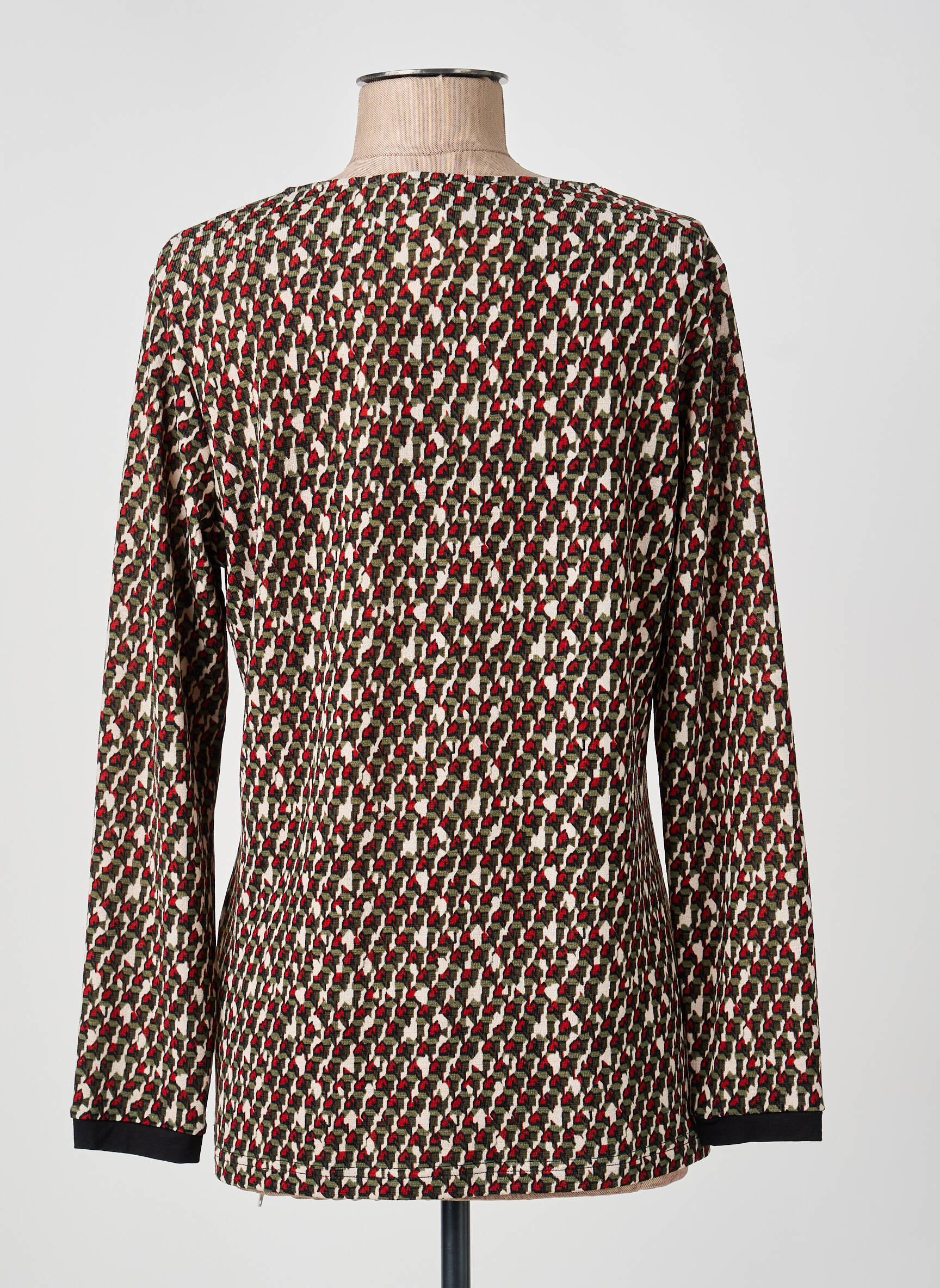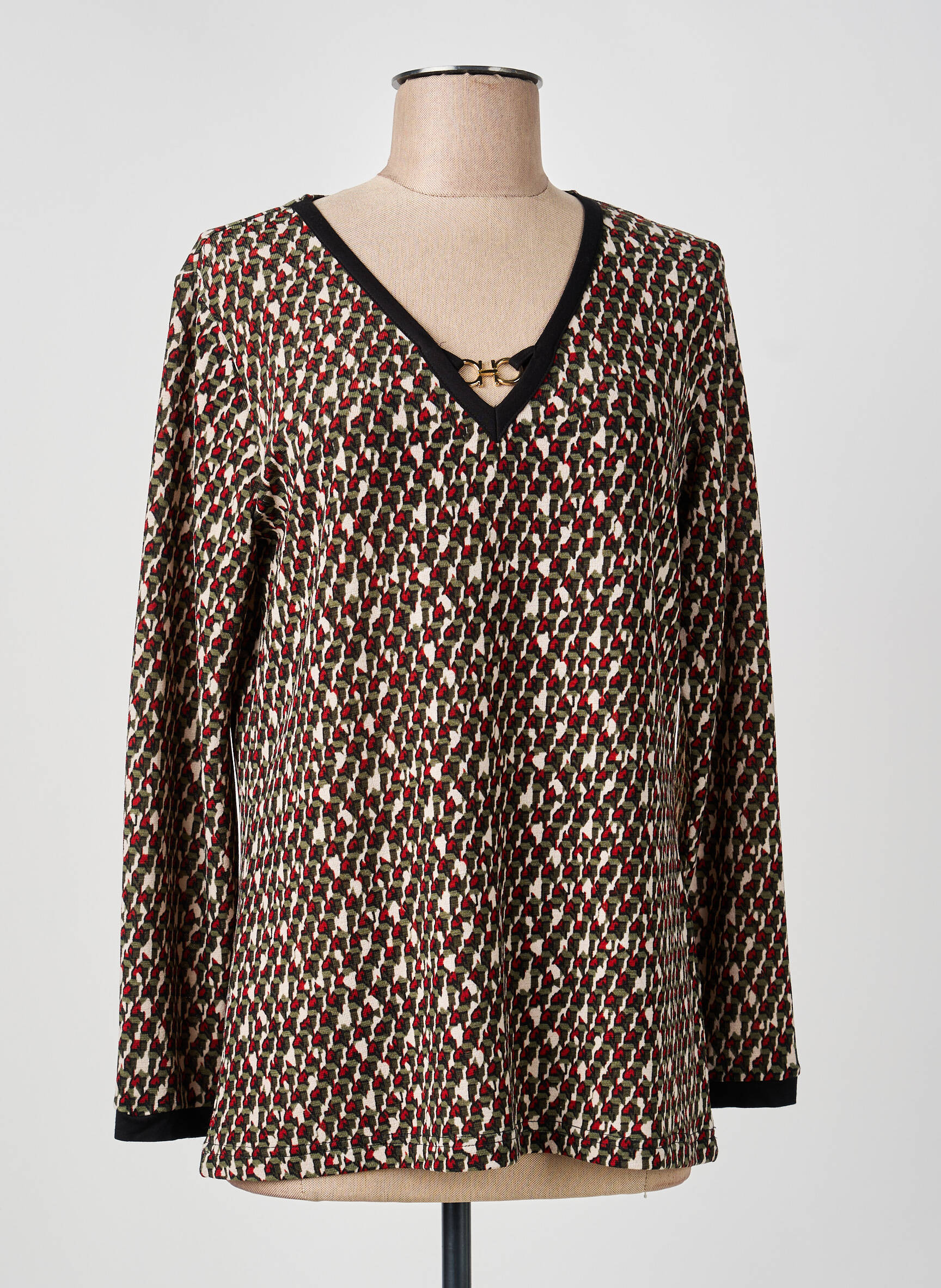 Craquez pour ce top GUY DUBOUIS à prix mini, idéal pour donner du style à votre garde-robe sans vous ruiner. Son motif graphique allie des touches de rouge, noir et beige, tandis que le col en V délicatement bordé de noir apporte une touche d’élégance discrète. On aime ses finitions contrastées et sa coupe fluide qui assure un confort au quotidien, parfait pour un look chic et décontracté à petit prix.