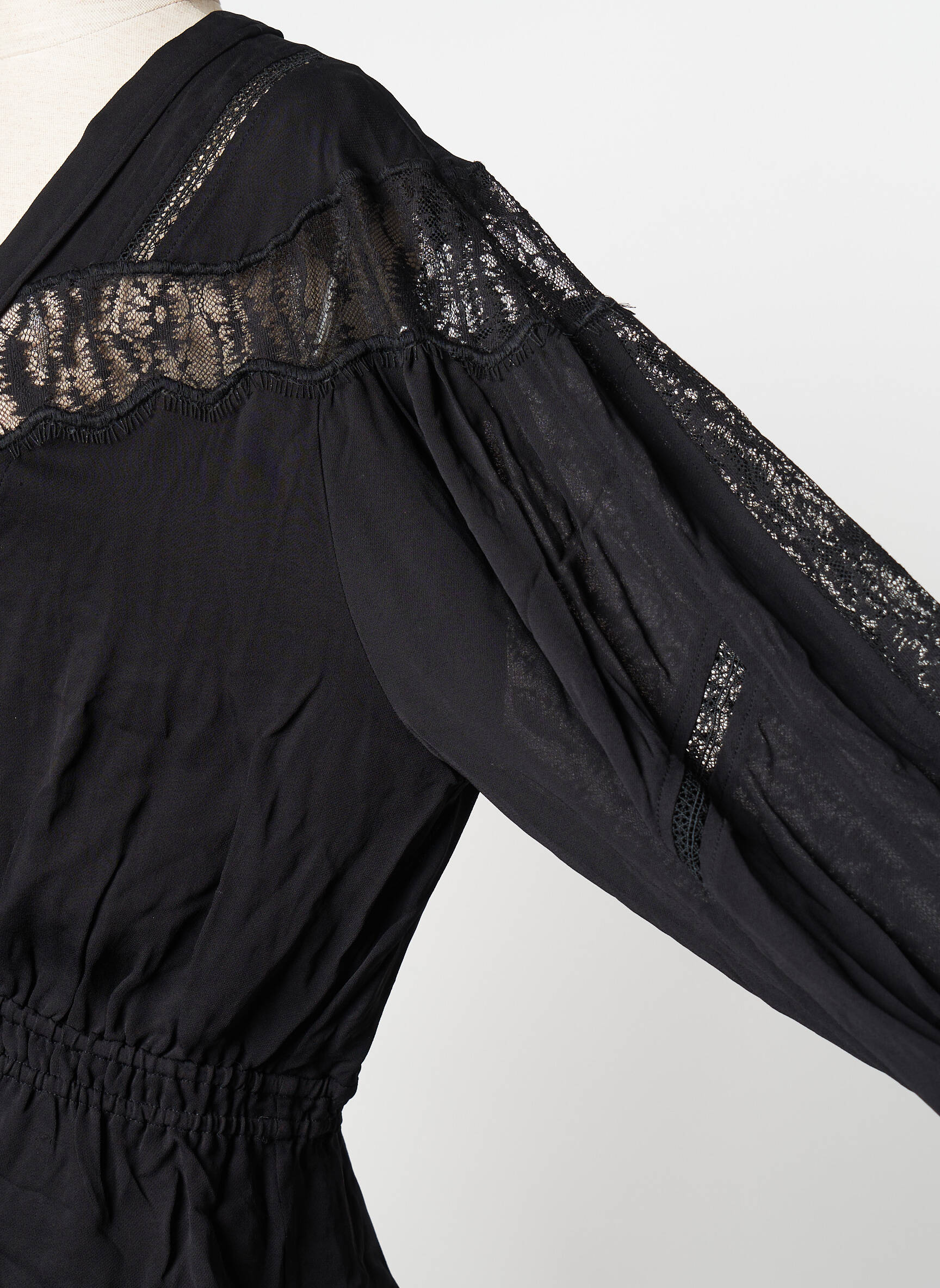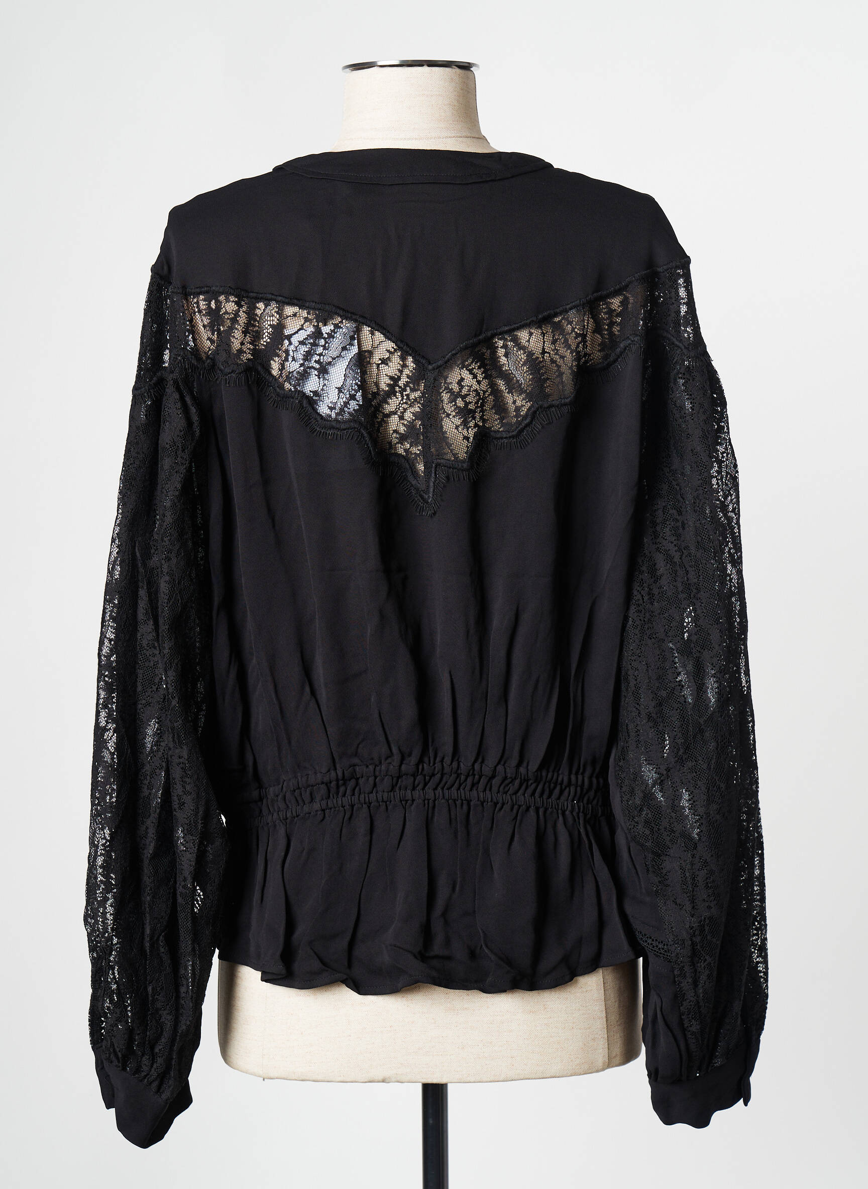 Imaginez la douceur du voile de nuit capturée dans un top élégant signé IRO, où le noir profond s'anime grâce à des détails en dentelle délicate qui ornent subtilement les épaules et les manches, apportant une touche de romantisme discret à une silhouette fluide et légèrement plissée. Le décolleté en V profond, souligné par une coupe croisée, révèle une allure à la fois audacieuse et raffinée, tandis que la taille élastiquée structure le vêtement en lui donnant un mouvement féminin et flatteur. Les manches longues agrémentées de petites fronces et d'une finition boutonnée complètent ce modèle qui allie parfaitement allure bohème et sophistication urbaine.