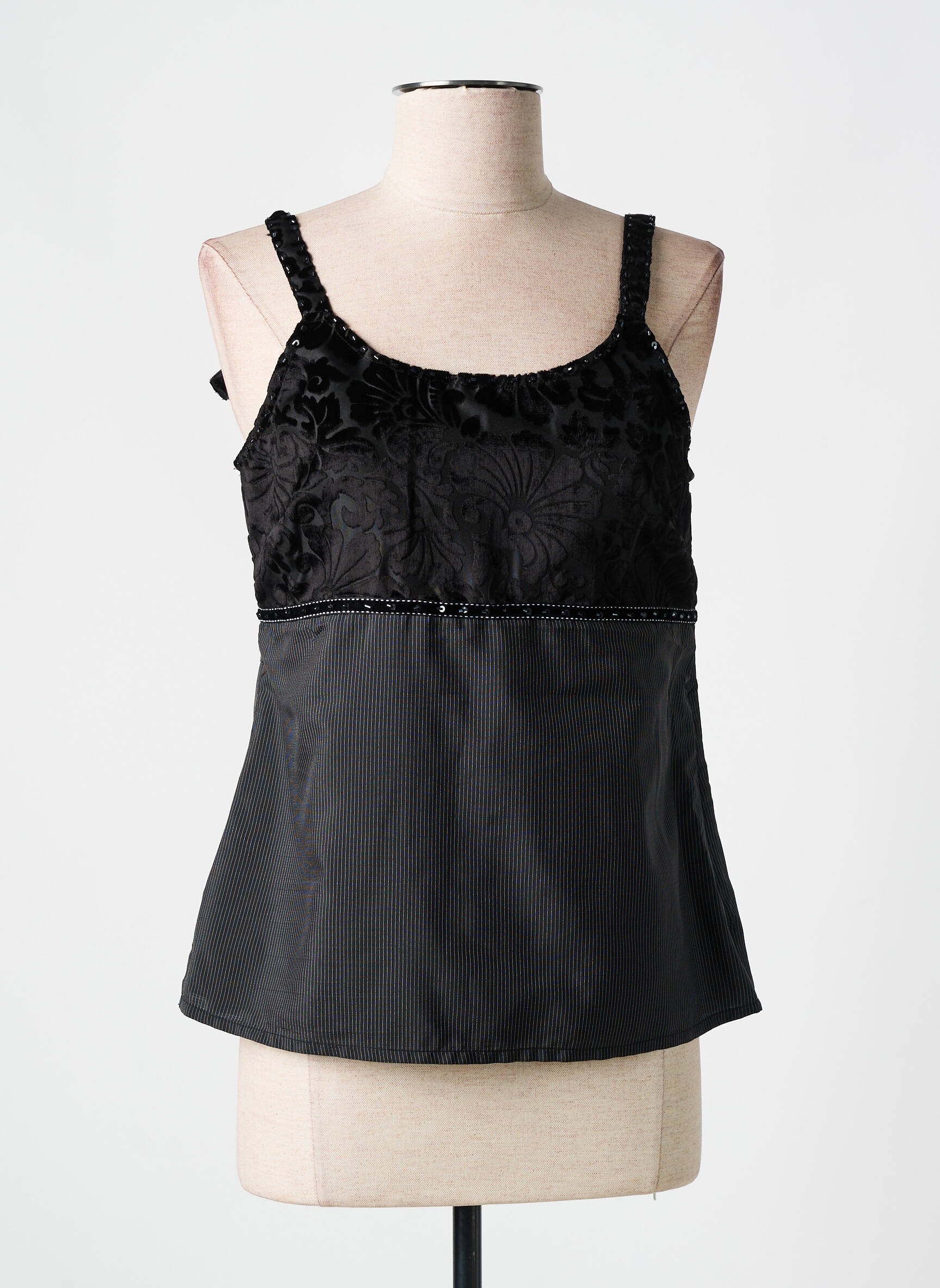Osez l'élégance discrète avec ce top JAC JAC pour femme qui marie avec finesse textures et détails délicats. Le haut du vêtement dévoile un tissu brodé noir aux motifs floraux sophistiqués, tandis que la partie inférieure contraste par une matière plus lisse et légèrement structurée, offrant une silhouette fluide et féminine. Les bretelles tressées apportent une touche artisanale et originale, rendant ce top aussi unique que polyvalent, parfait pour sublimer une tenue avec subtilité et raffinement.