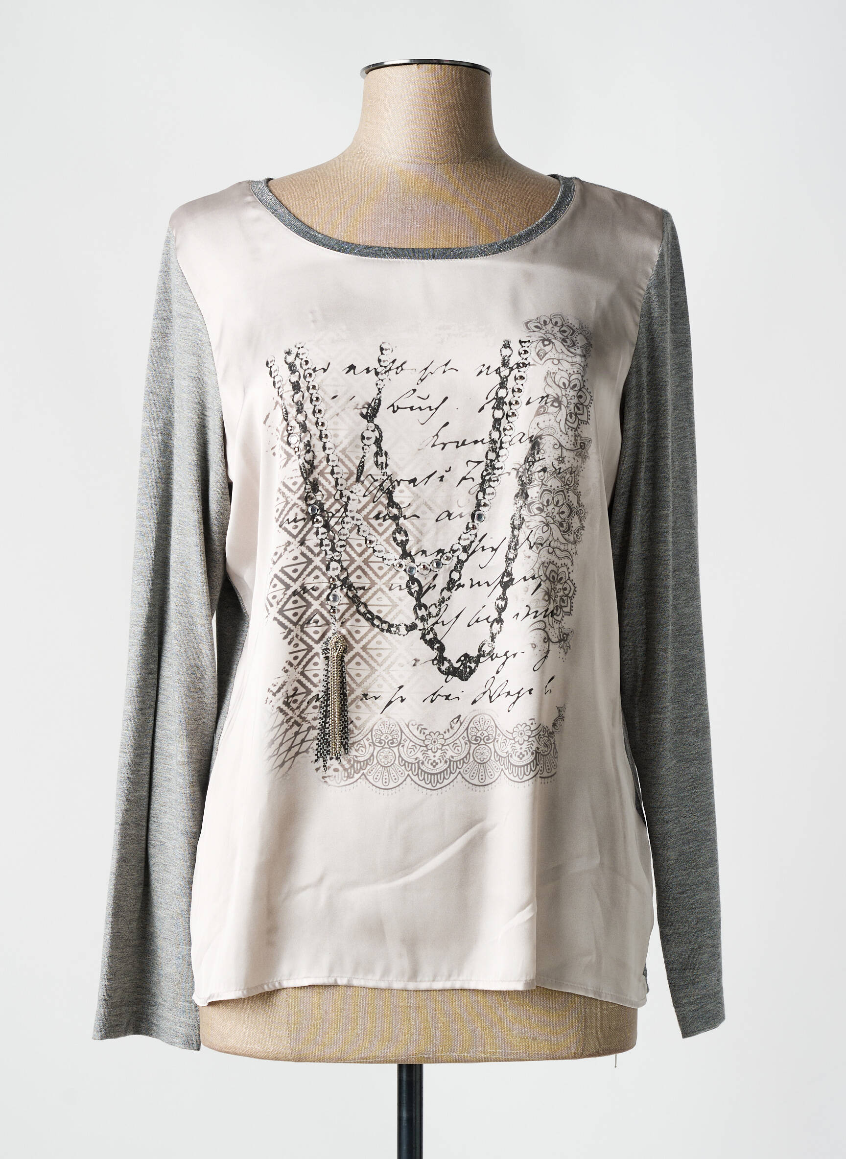 Craquez pour ce top JUSTWHITE à prix tout doux, idéal pour renouveler votre garde-robe sans vous ruiner tout en gardant une allure raffinée. Sa coupe fluide et féminine est sublimée par un devant satiné orné d’un motif graphique mêlant écritures et chaines fantaisie, tandis que les manches longues et le dos en maille grise ajoutent une touche de modernité et de confort. Voilà un bon plan mode parfait pour un style chic et actuel à petit prix.