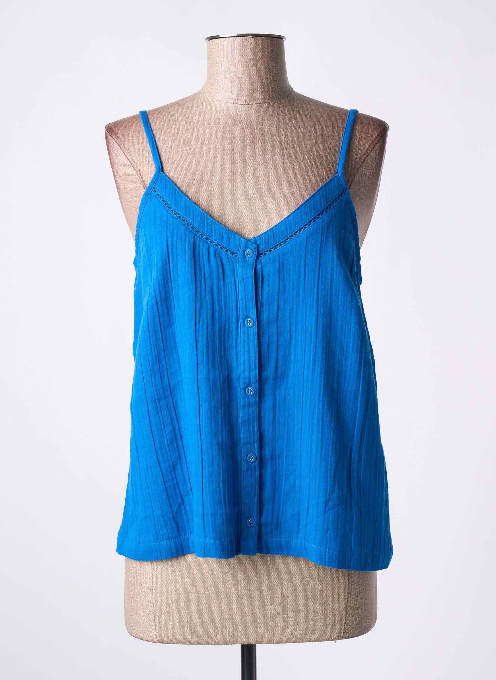 Imaginez un éclat méditerranéen capturé dans un top : ce modèle signé LA FIANCÉE en sublime bleu électrique mêle légèreté et fluidité grâce à sa texture délicatement plissée, tandis que ses fines bretelles et sa coupe ample offrent un confort aérien parfait pour les journées ensoleillées, sublimé par une série de boutons fonctionnels qui apportent une touche délicate et pratique.