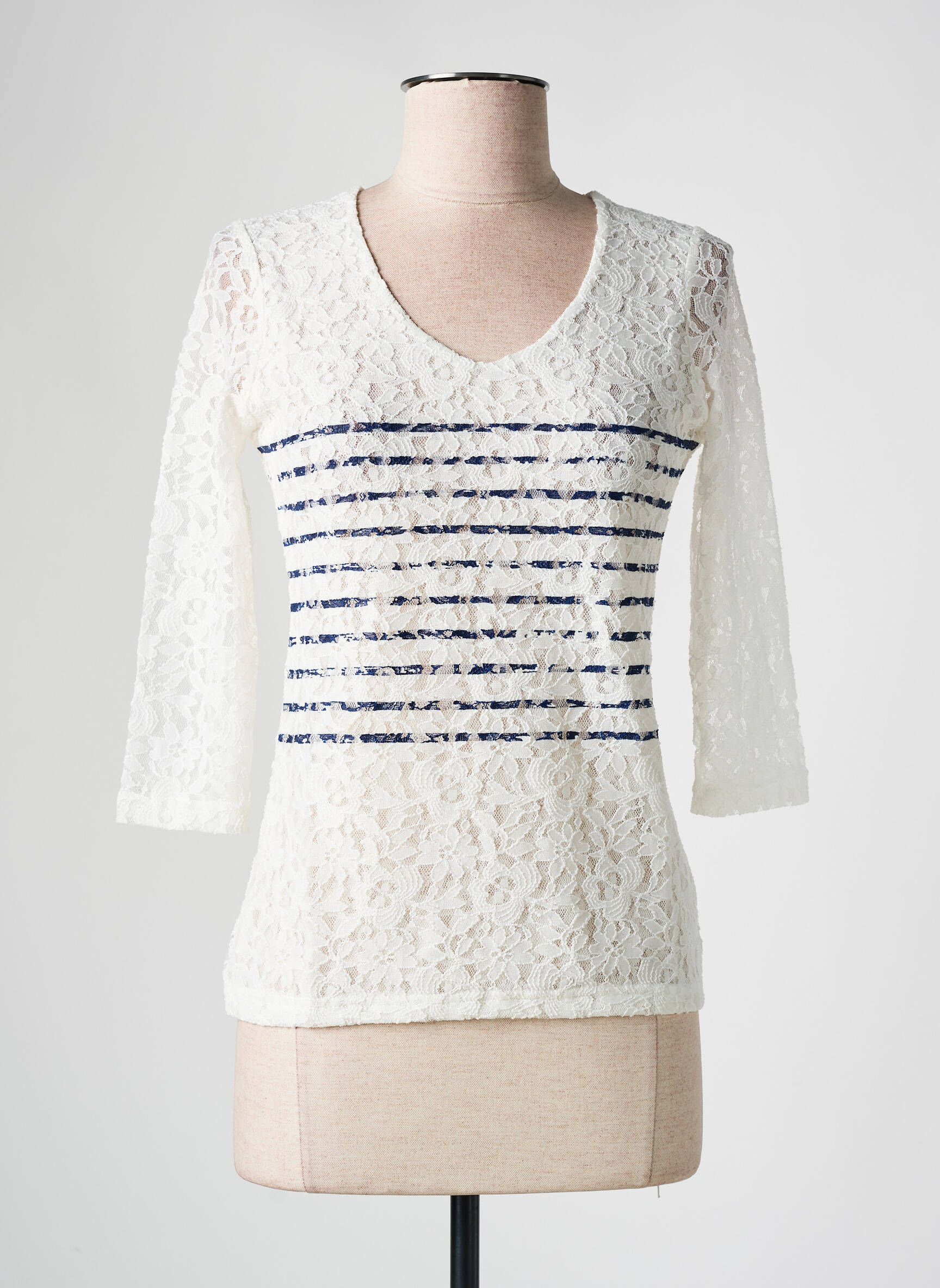 Craquez pour ce superbe top femme LES BONHEURS DE SOPHIE, un vrai bon plan pour celles qui veulent allier élégance et petit prix. Avec sa dentelle blanche délicate et ses manches trois-quarts, ce haut offre une touche féminine et chic à toutes vos tenues, tandis que les bandes marines subtilement pailletées apportent un effet moderne très tendance. Profitez-en vite pour ajouter une pièce unique à votre dressing sans vous ruiner !