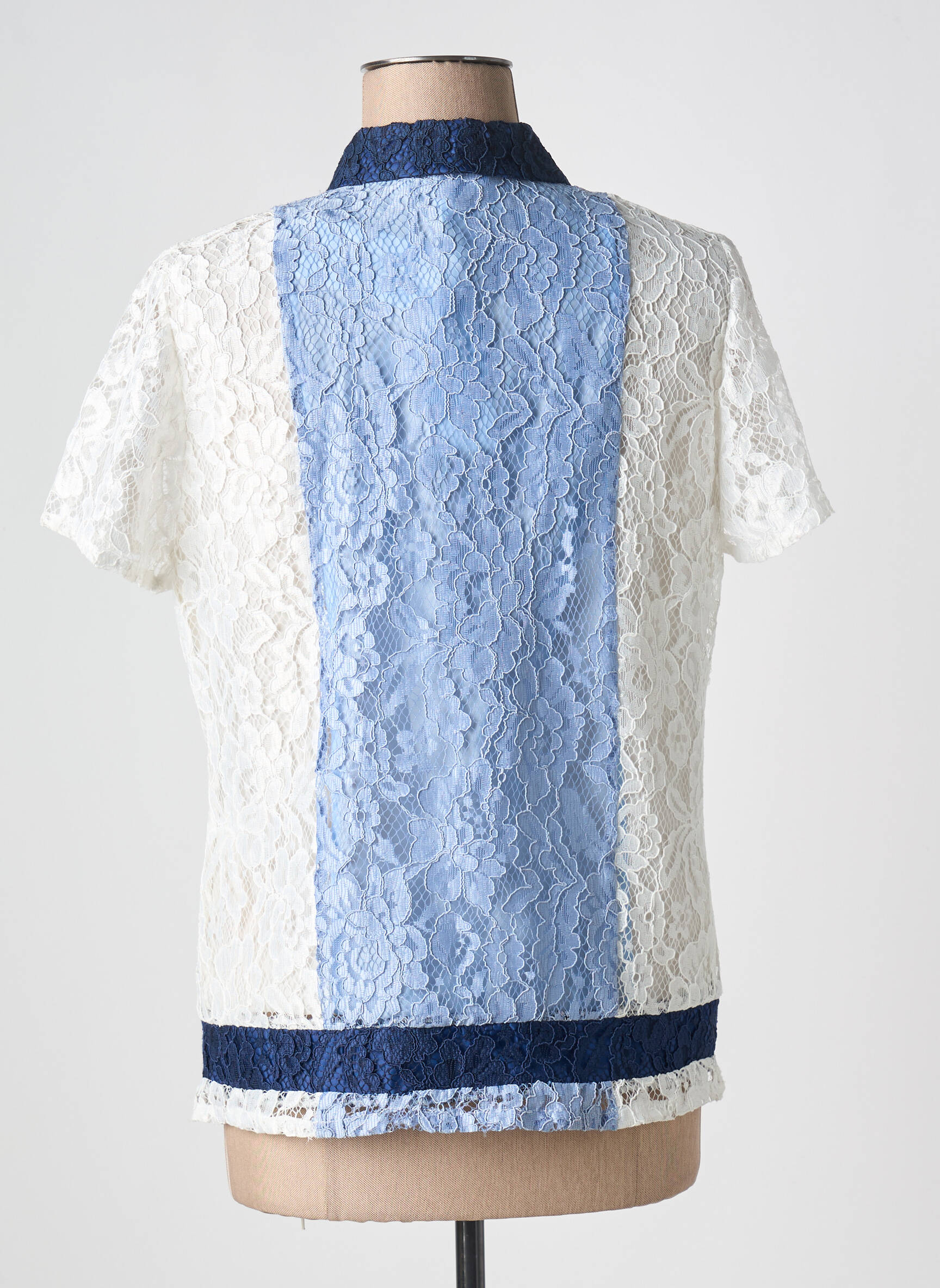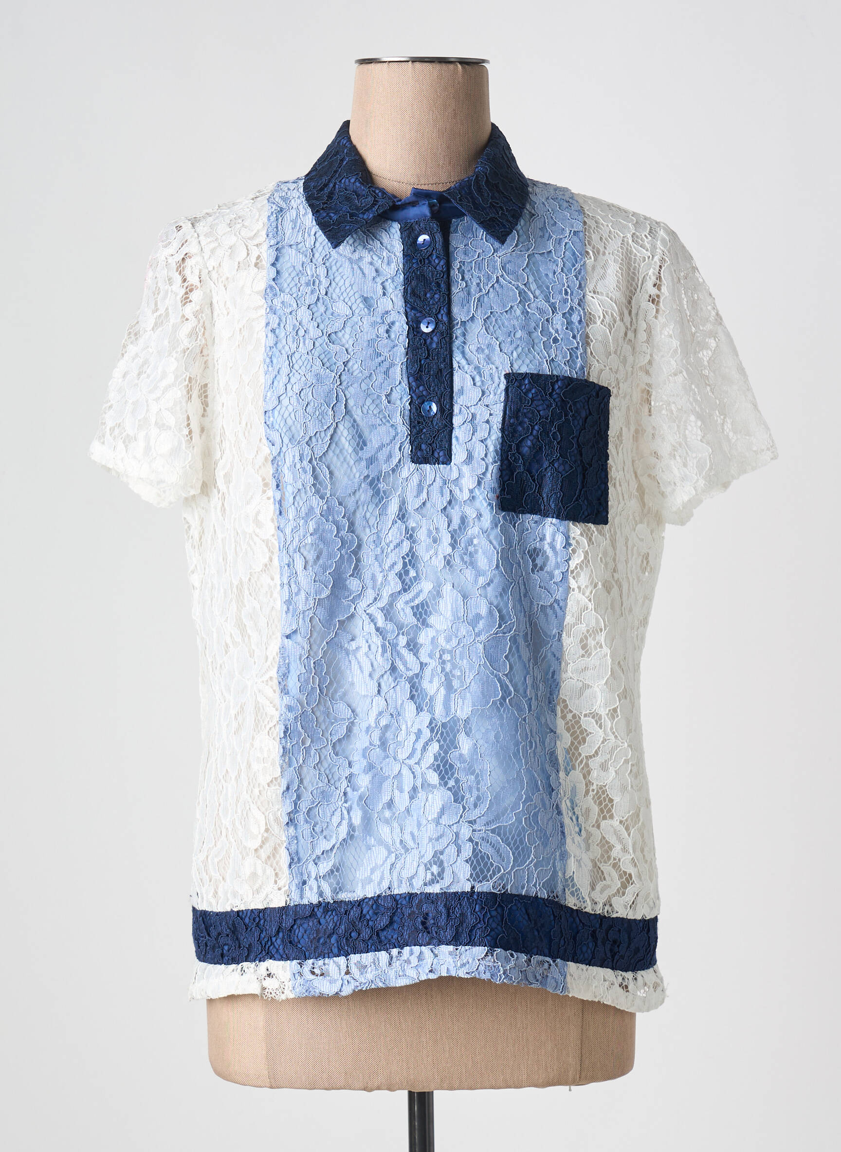Craquez pour ce top MERI & ESCA pour femme, la pièce idéale pour shopper un look tendance à petit prix sans compromettre le style. Sa dentelle délicate blanche rehaussée d’un panneau central bleu clair et de détails bleu marine, comme le col, la poche poitrine et la bande du bas, en font un choix élégant et original pour toutes vos tenues. Un véritable bon plan pour ajouter une touche sophistiquée à votre garde-robe sans vous ruiner.