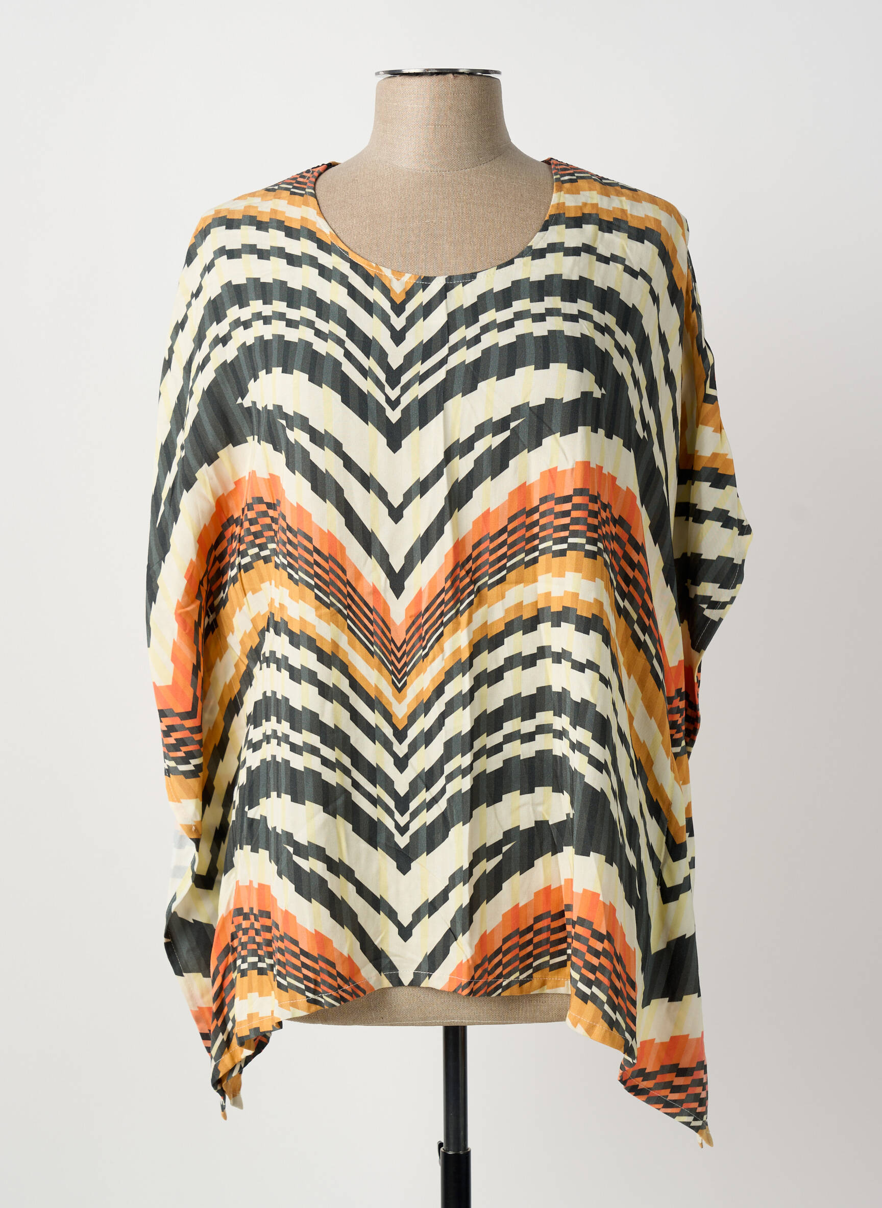 Profitez d’un bon plan mode avec ce top MERI & ESCA pour femme, parfait pour ajouter une touche d’originalité à petit prix à votre dressing. Son motif graphique aux teintes chaudes, relevé de chevrons et d’effets plissés, offre une allure moderne et décontractée, facile à porter sur un jean ou une jupe pour un look tendance sans vous ruiner.