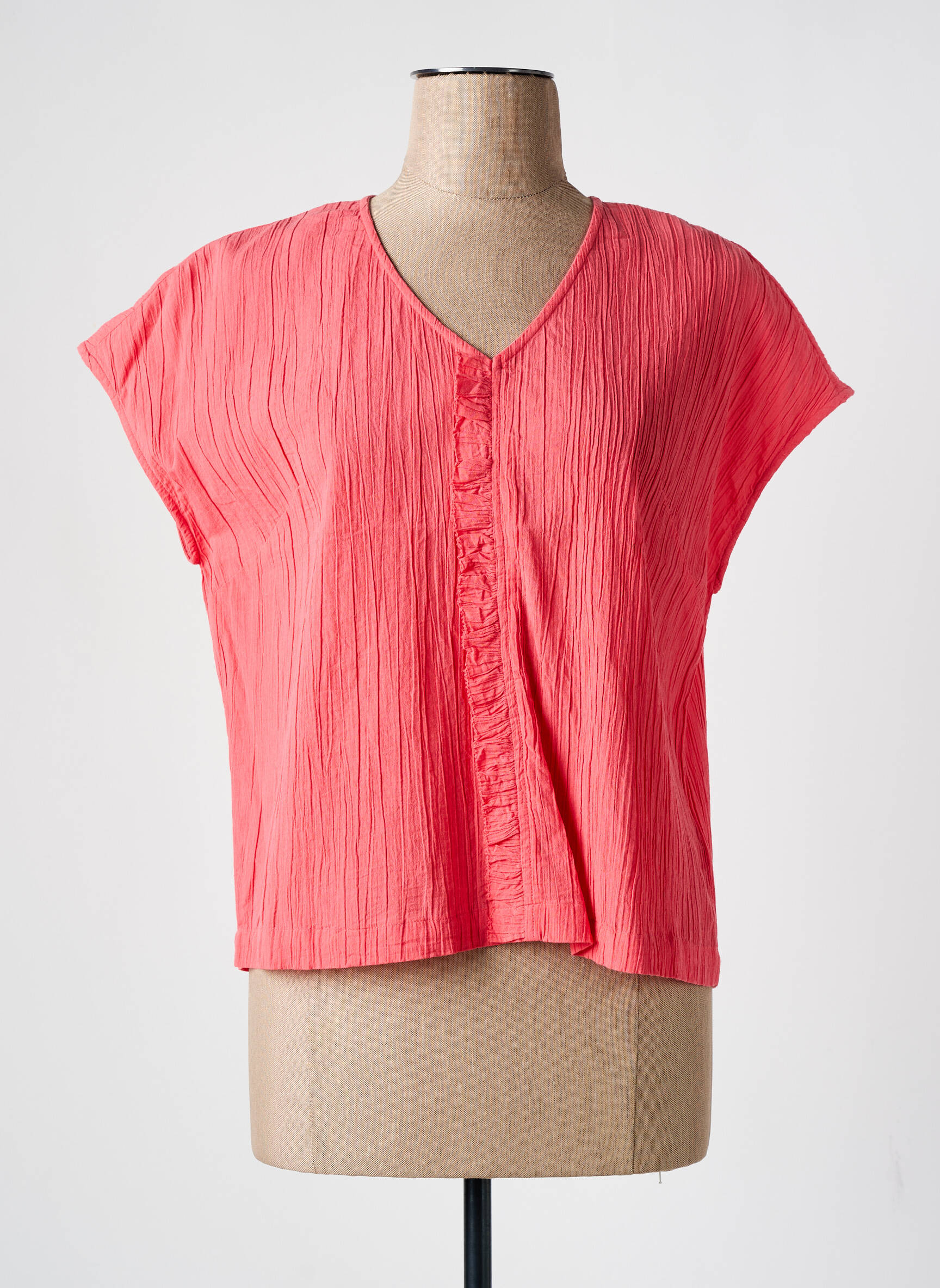 Profitez d’une belle opportunité pour renouveler votre garde-robe sans vous ruiner avec ce top femme signé NICE THINGS, qui allie la simplicité d’une coupe fluide à la fraîcheur d’un tissu texturé rose corail. Son encolure en V met en valeur le décolleté tandis que le détail de petits boutons et le léger plissé apportent une touche féminine et décontractée, idéale à prix tout doux pour toutes vos envies de style du quotidien.