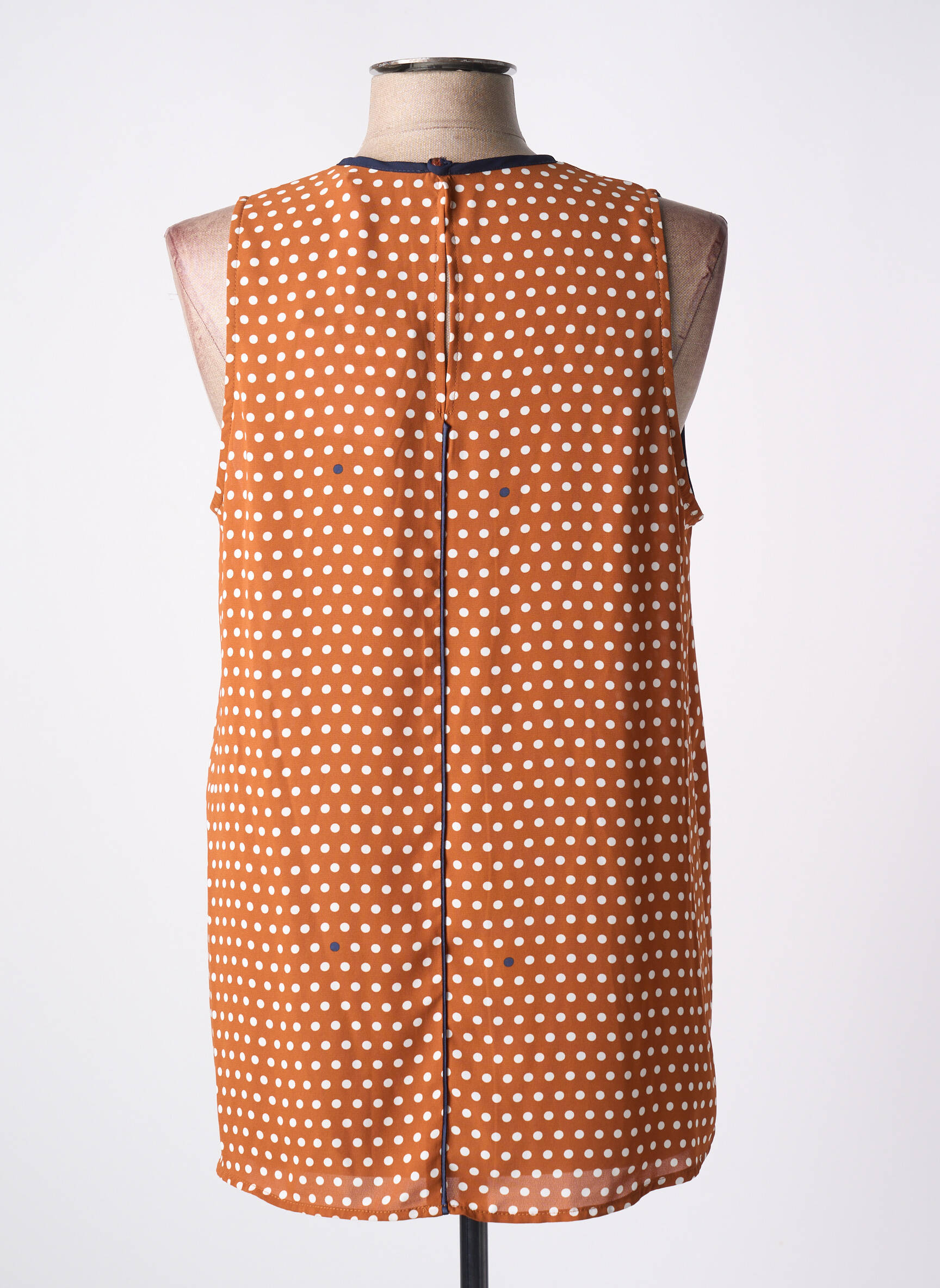 Plongez dans un univers où l'élégance rencontre la légèreté avec ce top de la marque Poussière d'Étoile. Arborant une teinte chaleureuse d'orange, ce modèle sans manches se distingue par ses pois blancs délicats qui apportent une touche de fraîcheur. La coupe fluide et légèrement évasée souligne la silhouette tout en offrant un confort inégalé. La bordure contrastante crée un délicat détail qui complète l'ensemble, faisant de ce top un incontournable pour les journées ensoleillées ou les soirées décontractées.