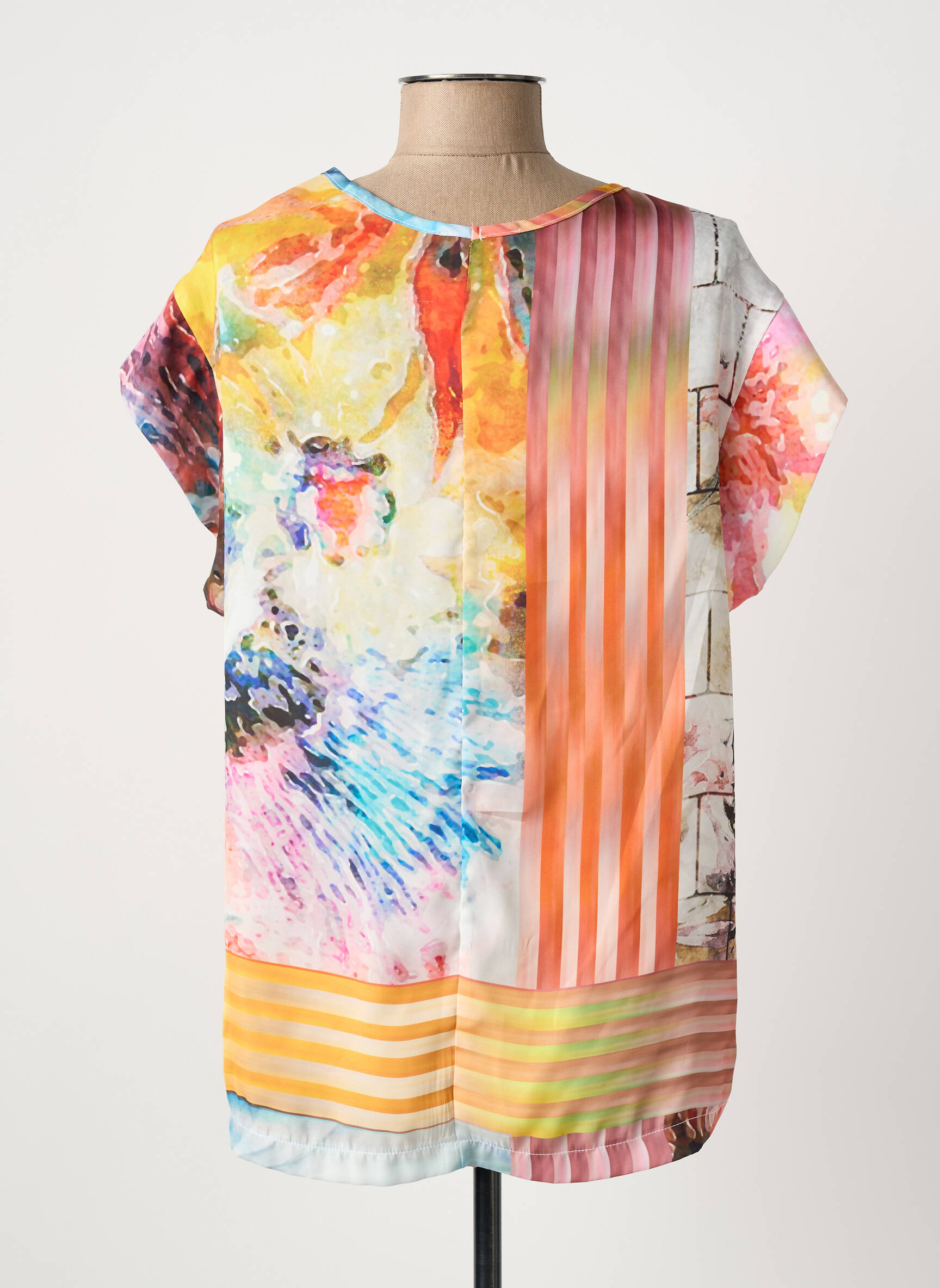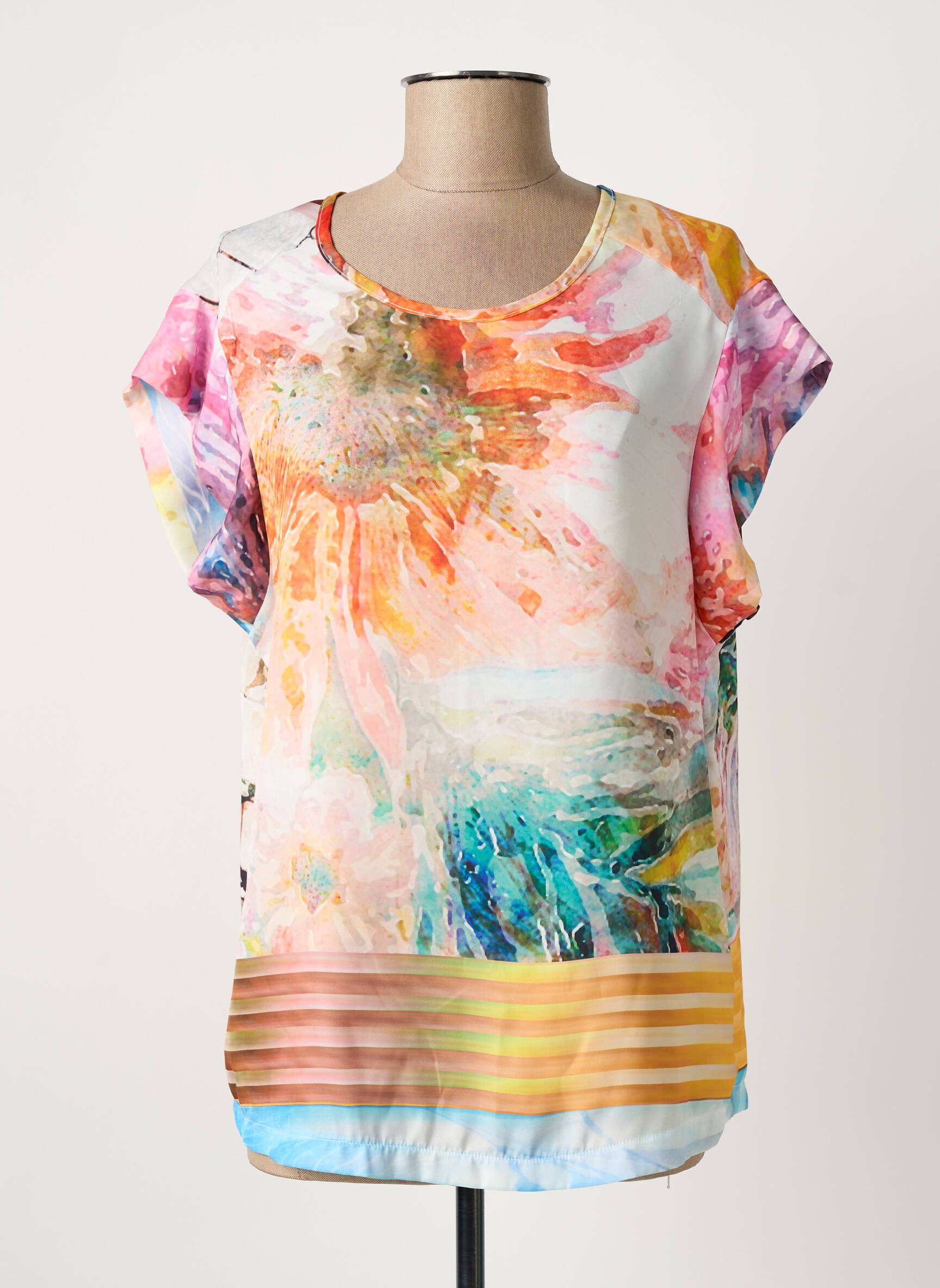 Craquez pour ce top QUATTRO pour femme à prix mini, un vrai bon plan pour ajouter une touche artistique et colorée à votre dressing sans vous ruiner. Son imprimé floral aux couleurs éclatantes et ses lignes graphiques en bas apportent originalité et fraîcheur à toutes vos tenues, tout en assurant un confort léger et tendance, parfait pour la mi-saison ou les journées ensoleillées.