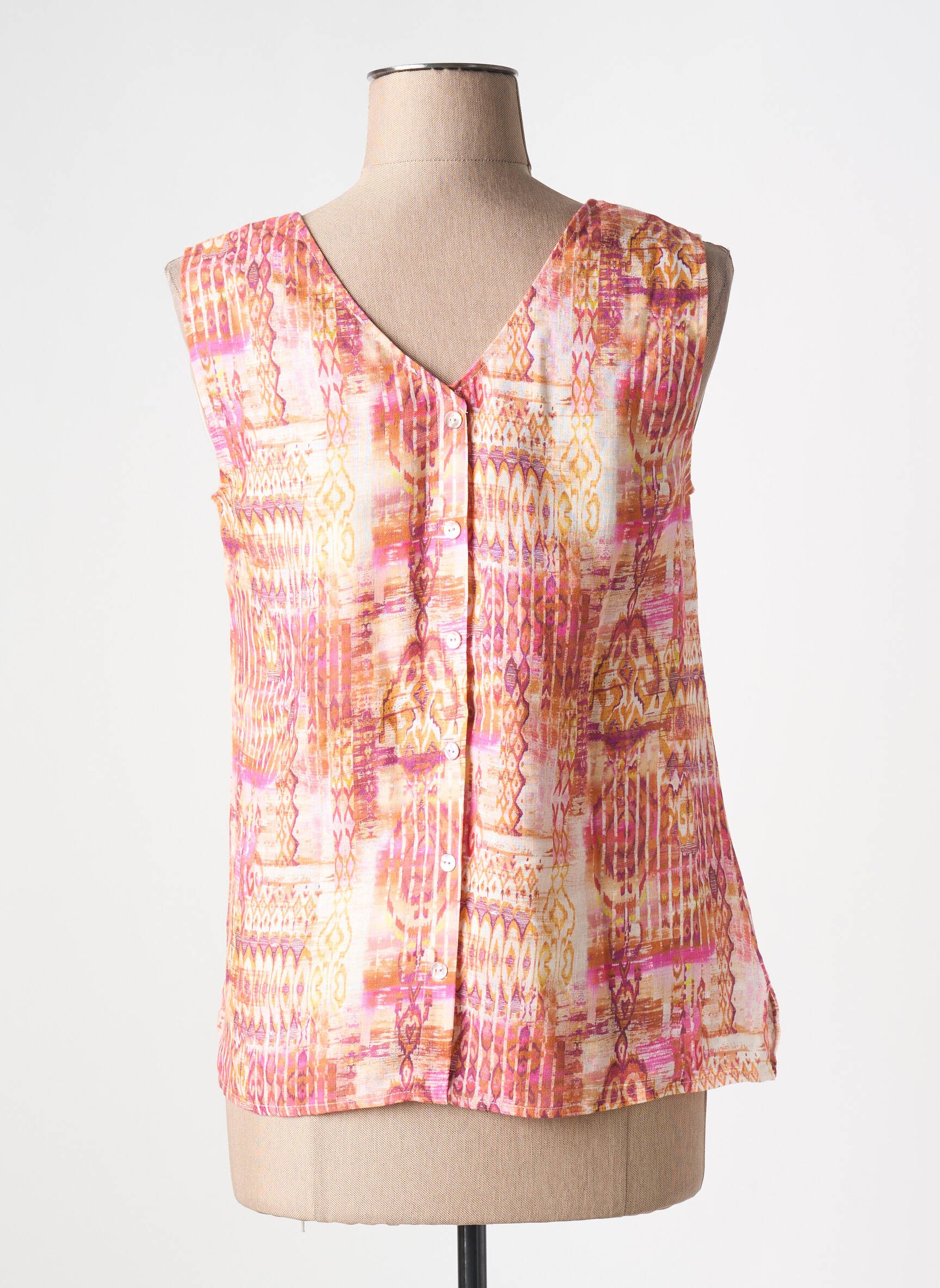Craquez pour ce top femme de la marque SIGNE NATURE à prix mini, parfait pour dynamiser votre dressing sans vous ruiner. Son imprimé coloré mélange subtilement des teintes chaudes de rose, jaune et orange dans un motif graphique qui illumine instantanément votre silhouette, tandis que la coupe fluide et l’encolure en V offrent un confort optimal pour le quotidien. Avec ce bon plan mode, vous profitez d’un look tendance et frais à petit prix, idéal pour se faire plaisir tout en réalisant de belles économies.