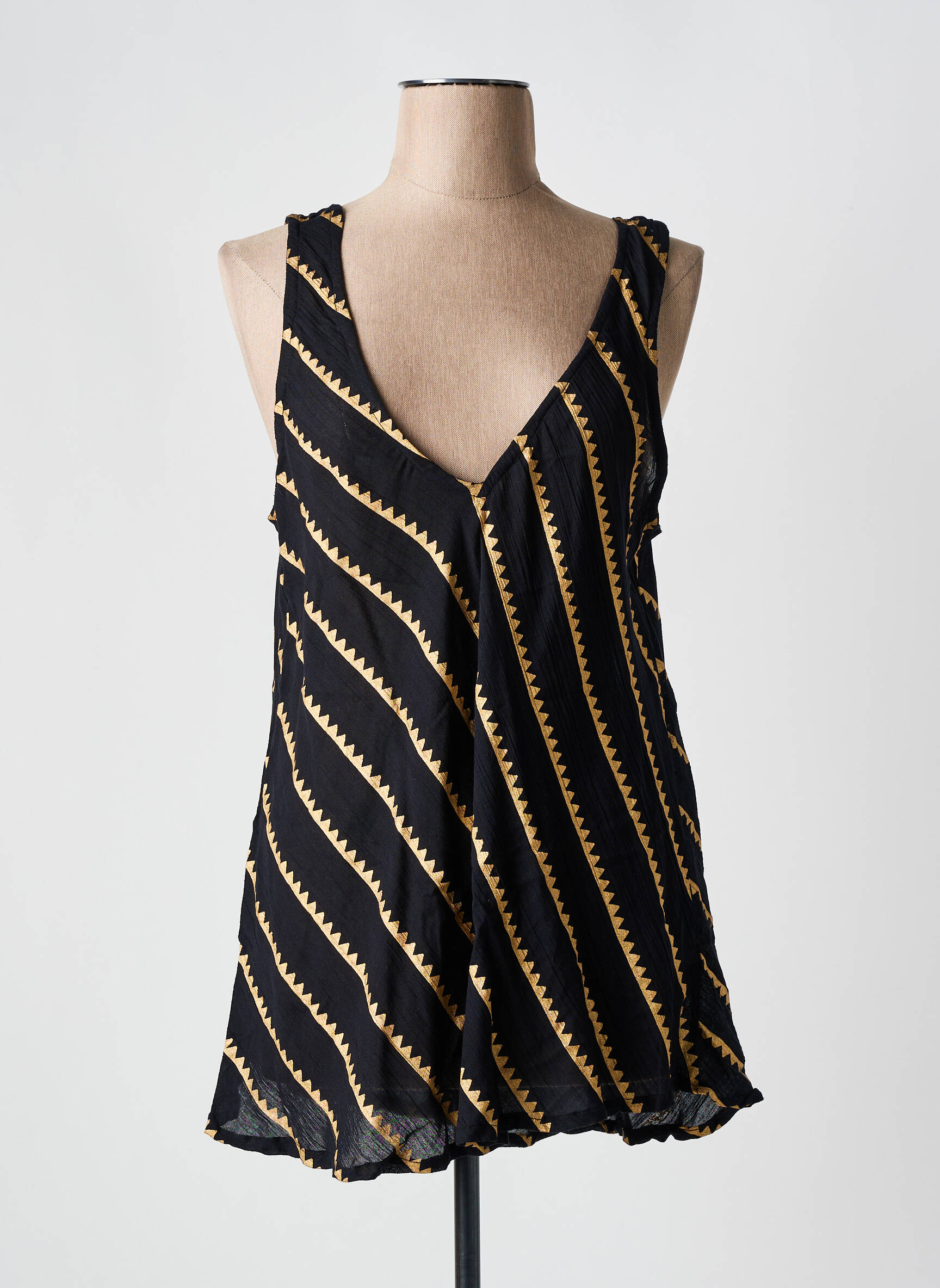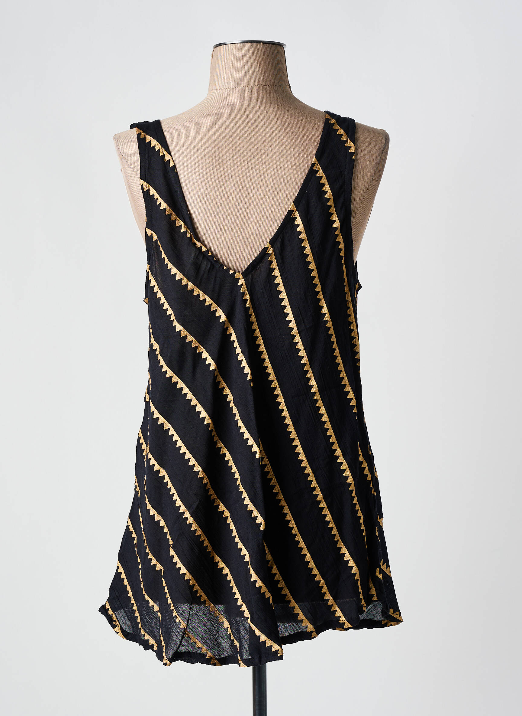 Craquez pour ce top femme SUMITRA à prix irrésistible, parfait pour celles qui veulent se faire plaisir sans se ruiner. Sa coupe fluide, son joli décolleté en V et son motif à rayures obliques noir, blanc et doré apportent une touche moderne et élégante à votre dressing, tout en garantissant une allure décontractée et tendance. Voilà une belle occasion de vous offrir une pièce stylée à petit prix.