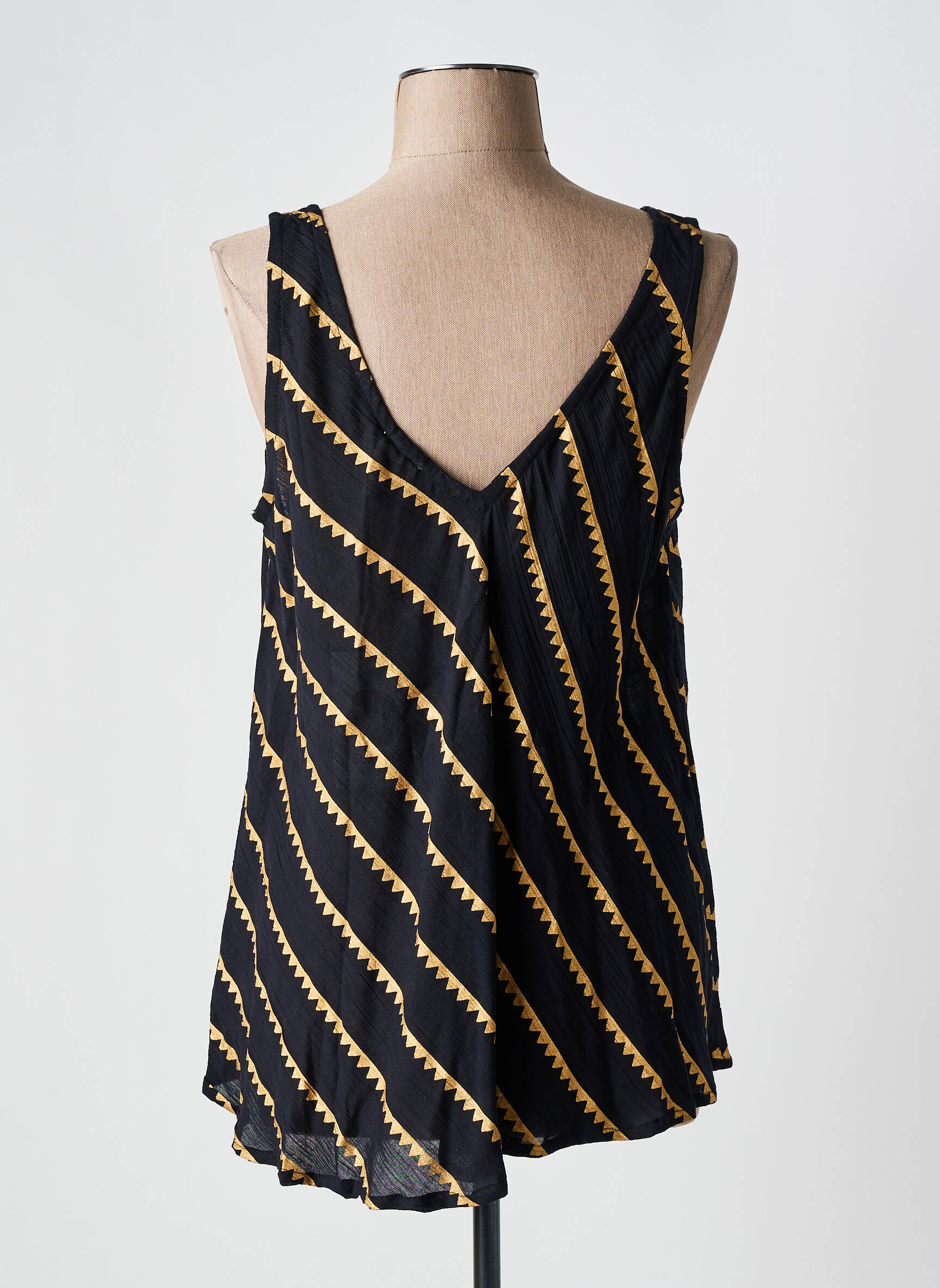 Saisissez une belle occasion de vous offrir un top tendance à prix mini avec ce modèle SUMITRA pour femme, qui séduit par ses rayures diagonales dorées sur fond noir pour une touche dynamique et moderne. Sa coupe fluide sans manches assure une grande liberté de mouvement et un confort idéal pour la belle saison, tout en apportant une note chic et originale à vos tenues du quotidien, sans vous ruiner.