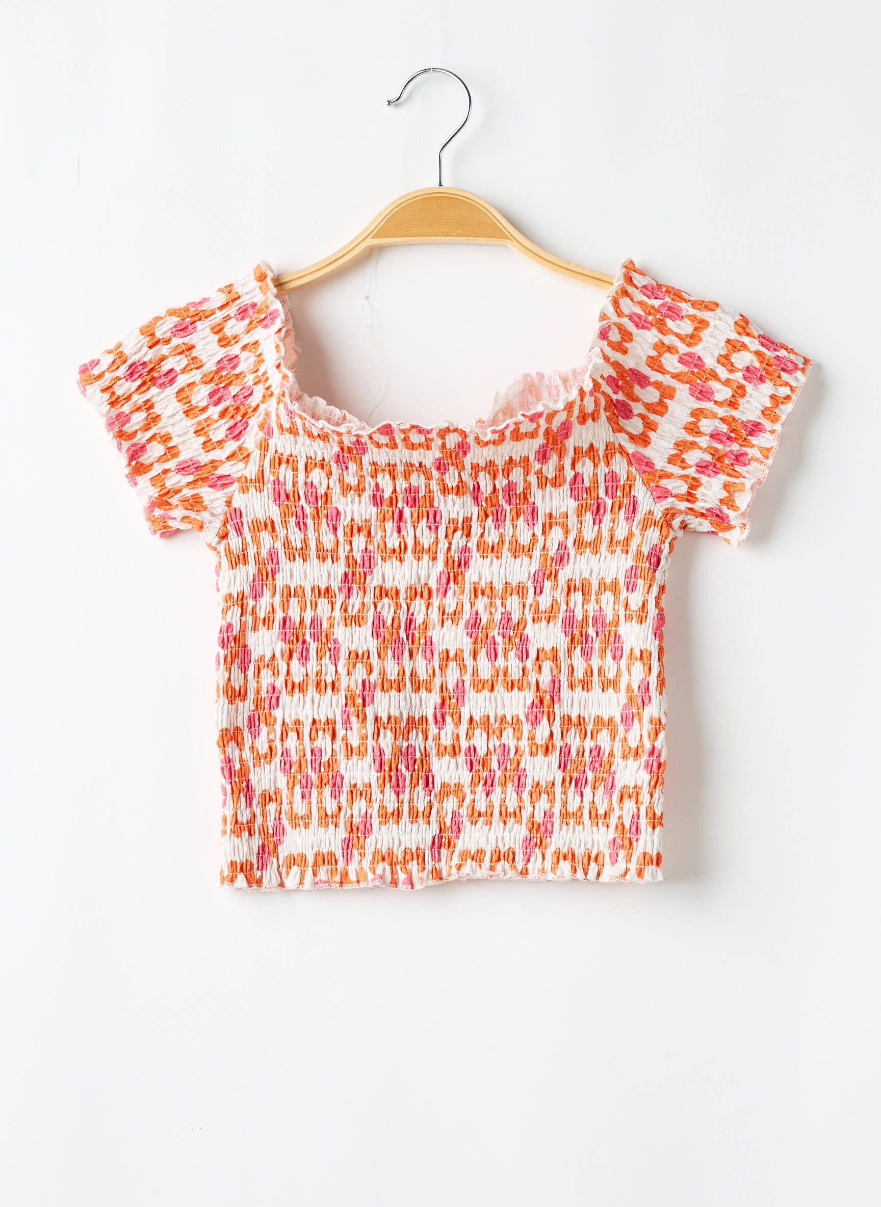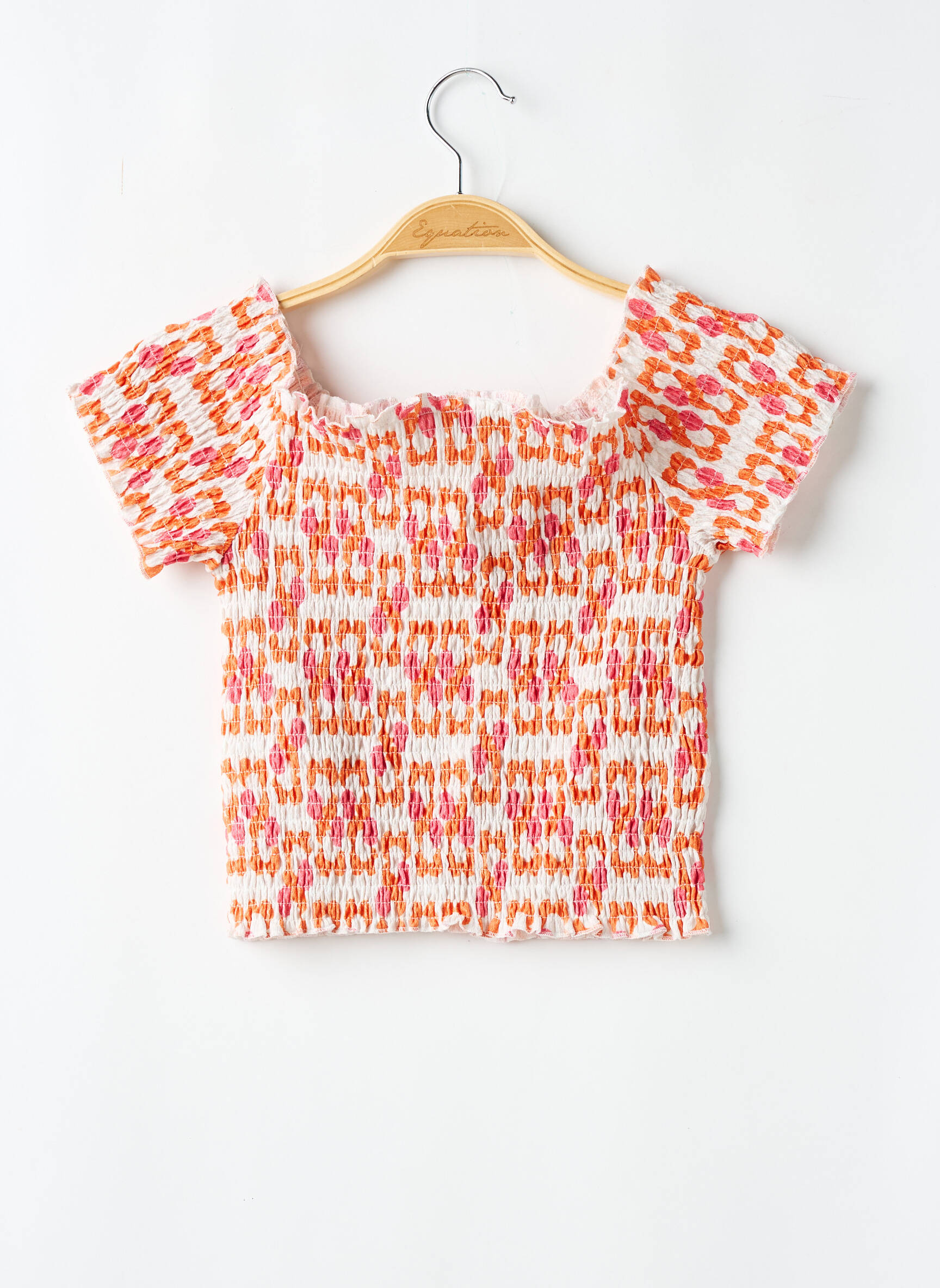 Craquez pour ce joli top TIFFOSI pour femme, une pépite à petit prix idéale pour rehausser votre dressing sans vous ruiner. Sa coupe courte et ajustée sublime la silhouette, tandis que son tissu smocké assure un grand confort et une jolie élasticité. Son motif coloré mêlant l’orange et le rose sur fond blanc apporte une touche de fraîcheur estivale, parfait pour donner du peps à vos tenues du quotidien sans dépenser une fortune.
