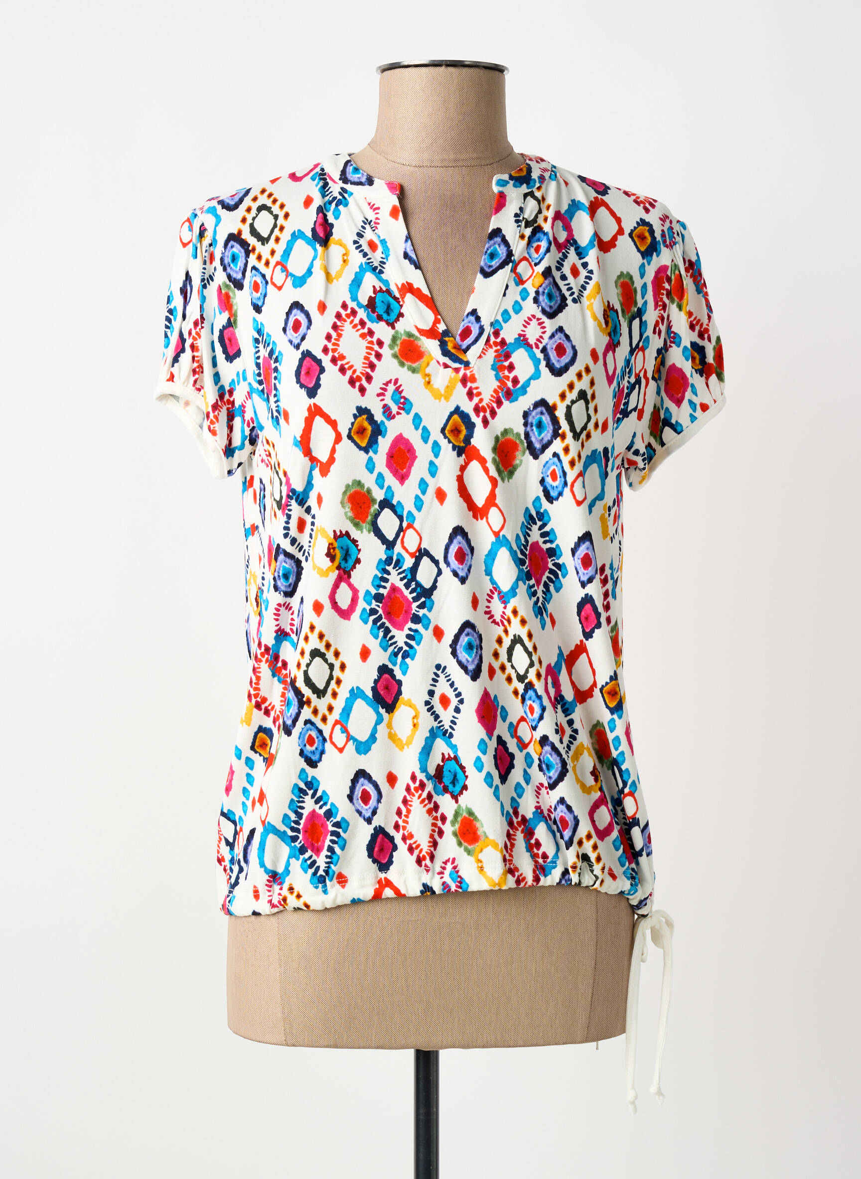 Craquez pour ce top femme TINTA STYLE à prix mini, idéal pour apporter une touche de fraîcheur et de gaieté à votre dressing sans vous ruiner. Ce modèle séduit par son imprimé graphique coloré, son encolure en V et son détail de cordon ajustable sur le côté qui apporte une note moderne et féminine à votre tenue. C’est la pièce parfaite pour dynamiser vos looks du quotidien, tout en profitant d’un bon plan incontournable.