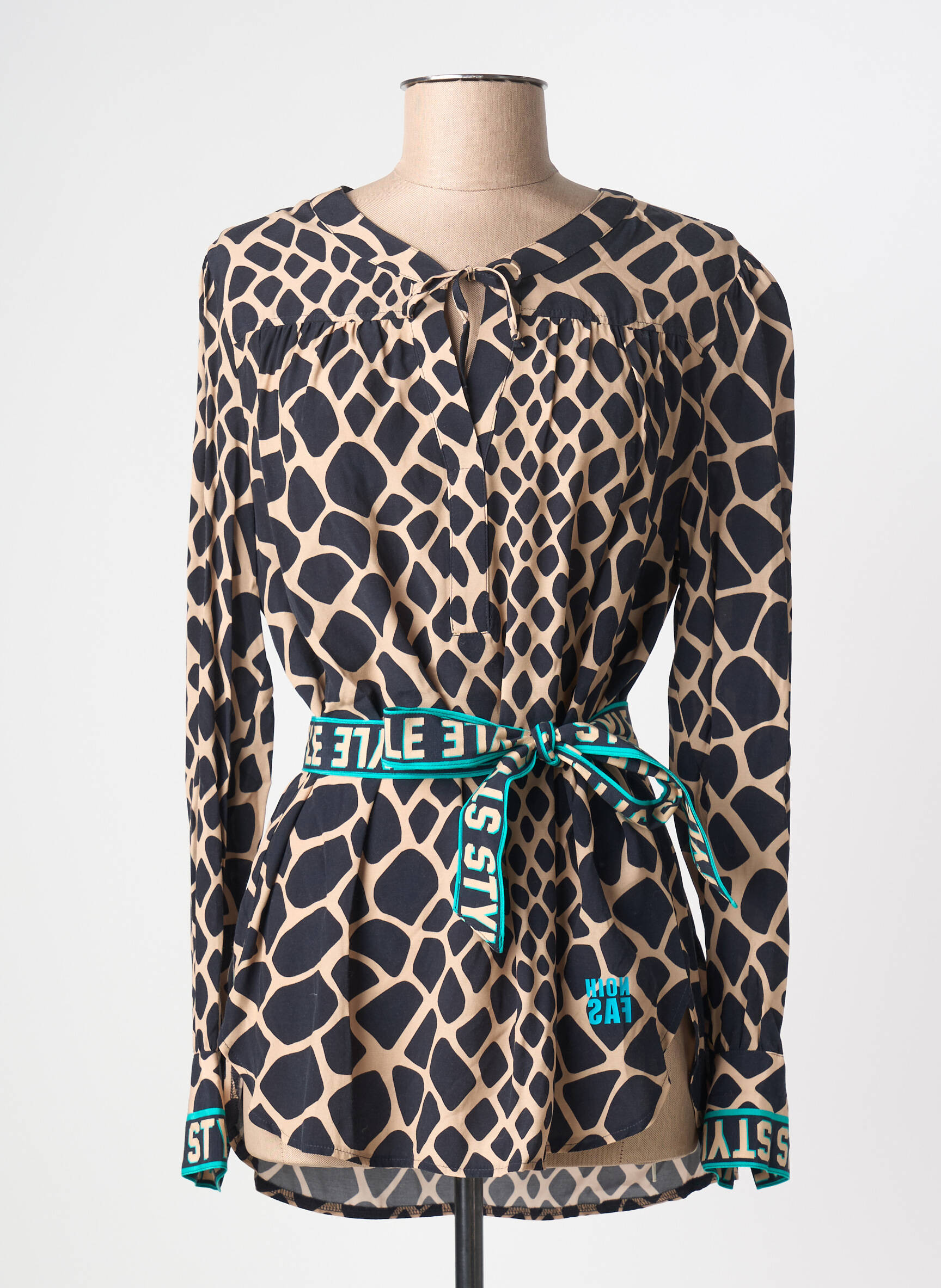 Craquez pour l’élégance tendance à prix tout doux avec ce top TUZZI pour femme qui se distingue par son imprimé graphique façon peau de girafe, idéal pour apporter du caractère à toutes vos tenues. Sa ceinture fantaisie à nouer souligne la taille et ajoute une touche résolument moderne grâce à ses inscriptions contrastées, tandis que la découpe goutte discrète au col vient sublimer le décolleté avec féminité. Voilà une pièce stylée et originale, parfaite pour se démarquer sans se ruiner !
