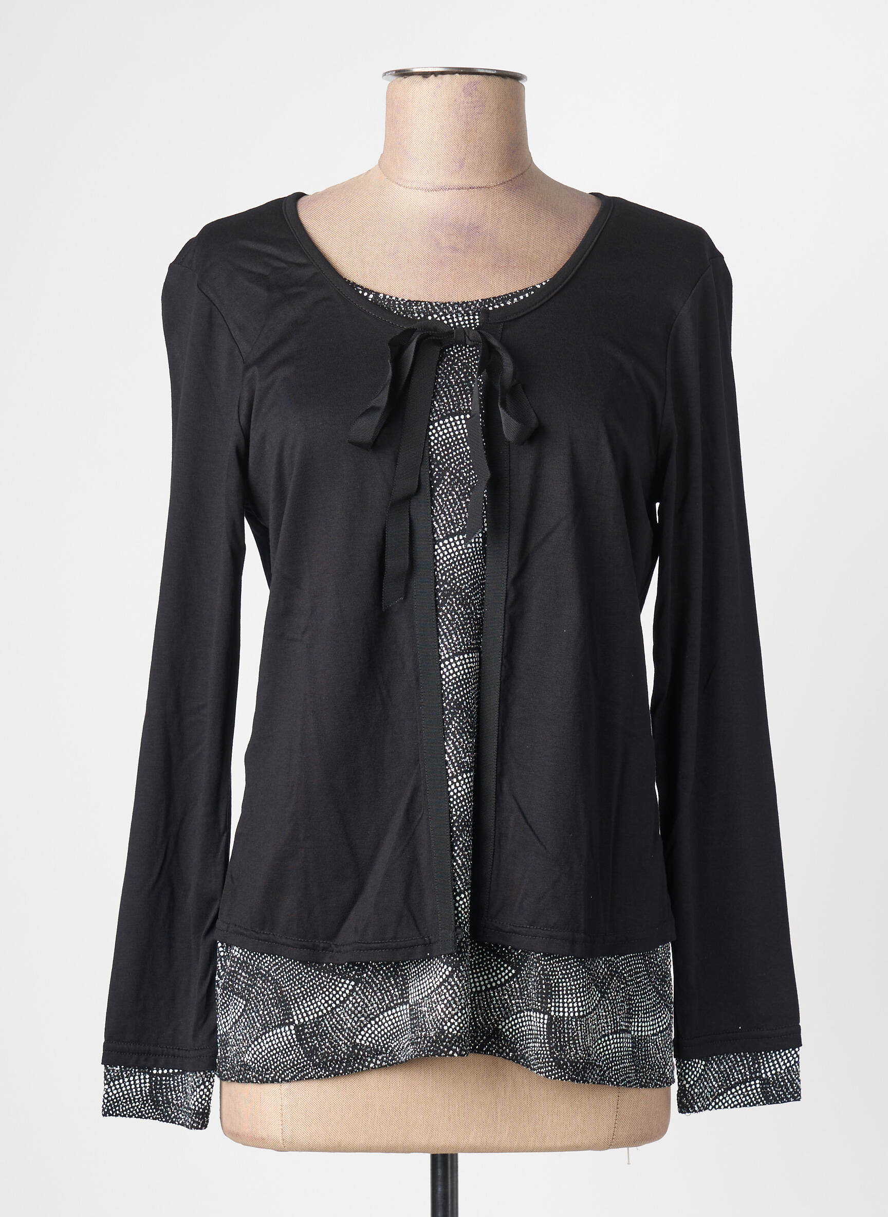 Craquez pour ce top femme VIE NOCTURNE à prix tout doux, idéal pour donner une touche élégante à votre garde-robe sans vous ruiner?; son effet superposé associe une base noire fluide à un empiècement imprimé graphique et des détails noués au col, pour un style chic à petit prix qui se porte aussi bien au quotidien qu’en soirée.