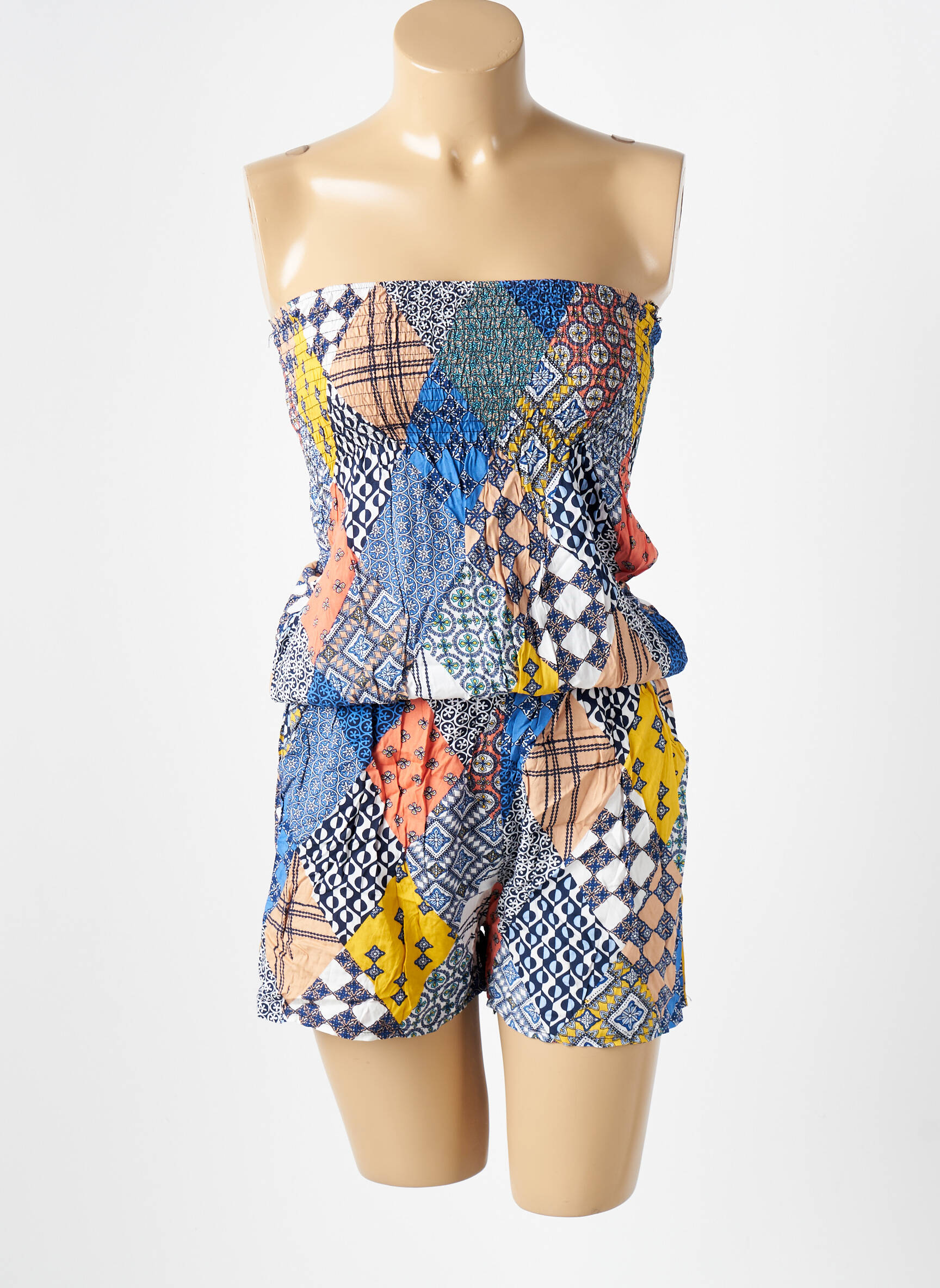 Craquez pour ce combishort D&X pour femme, une pièce tendance à prix mini pour celles qui adorent dénicher de vrais bons plans mode. Avec son imprimé patchwork coloré et son encolure bustier, ce modèle apporte une touche estivale et dynamique à votre dressing tout en vous garantissant une allure à la fois décontractée et féminine. Parfait pour un look casual et léger lors des journées ensoleillées, ce combishort allie confort et style sans vous ruiner.
