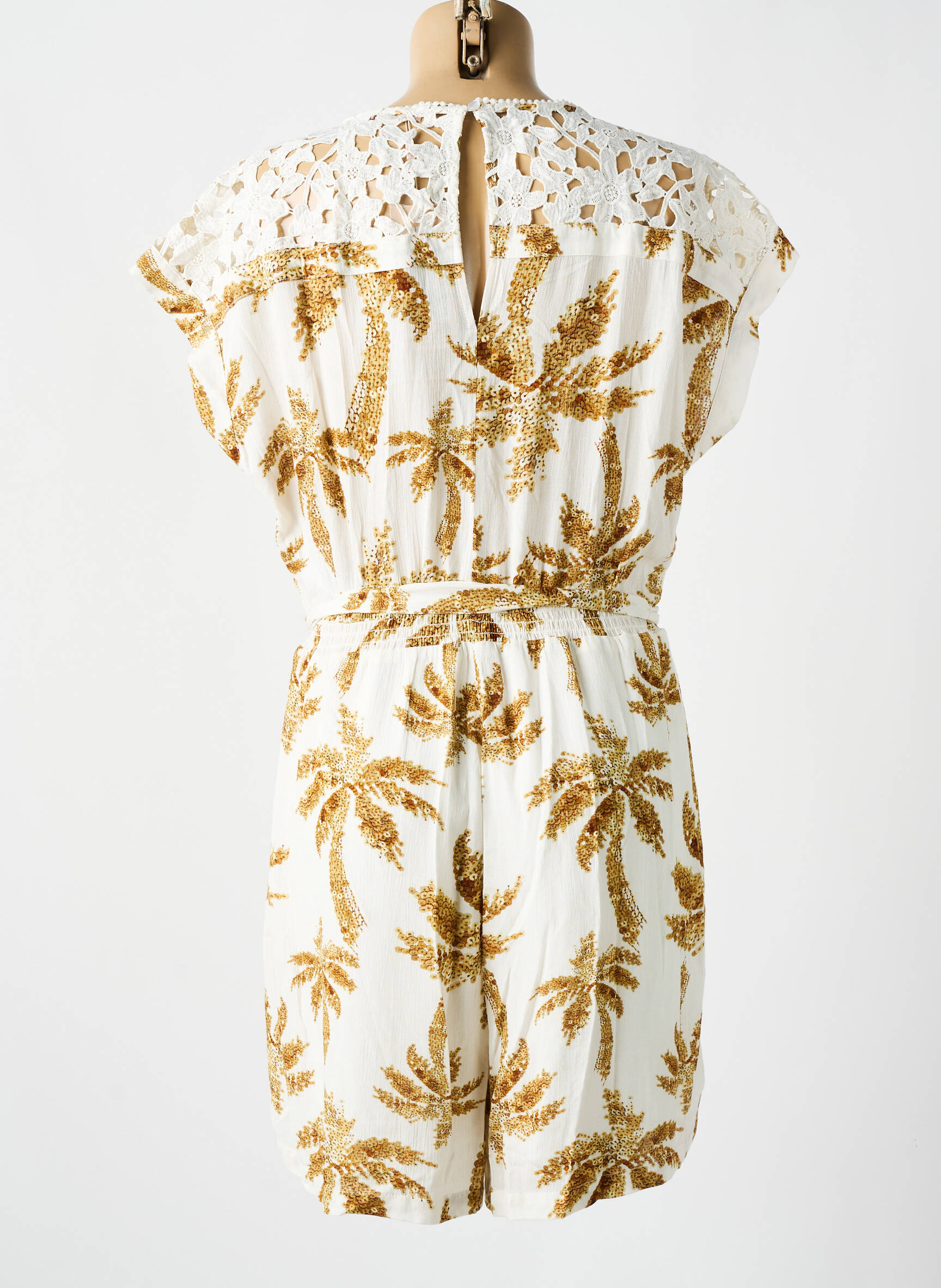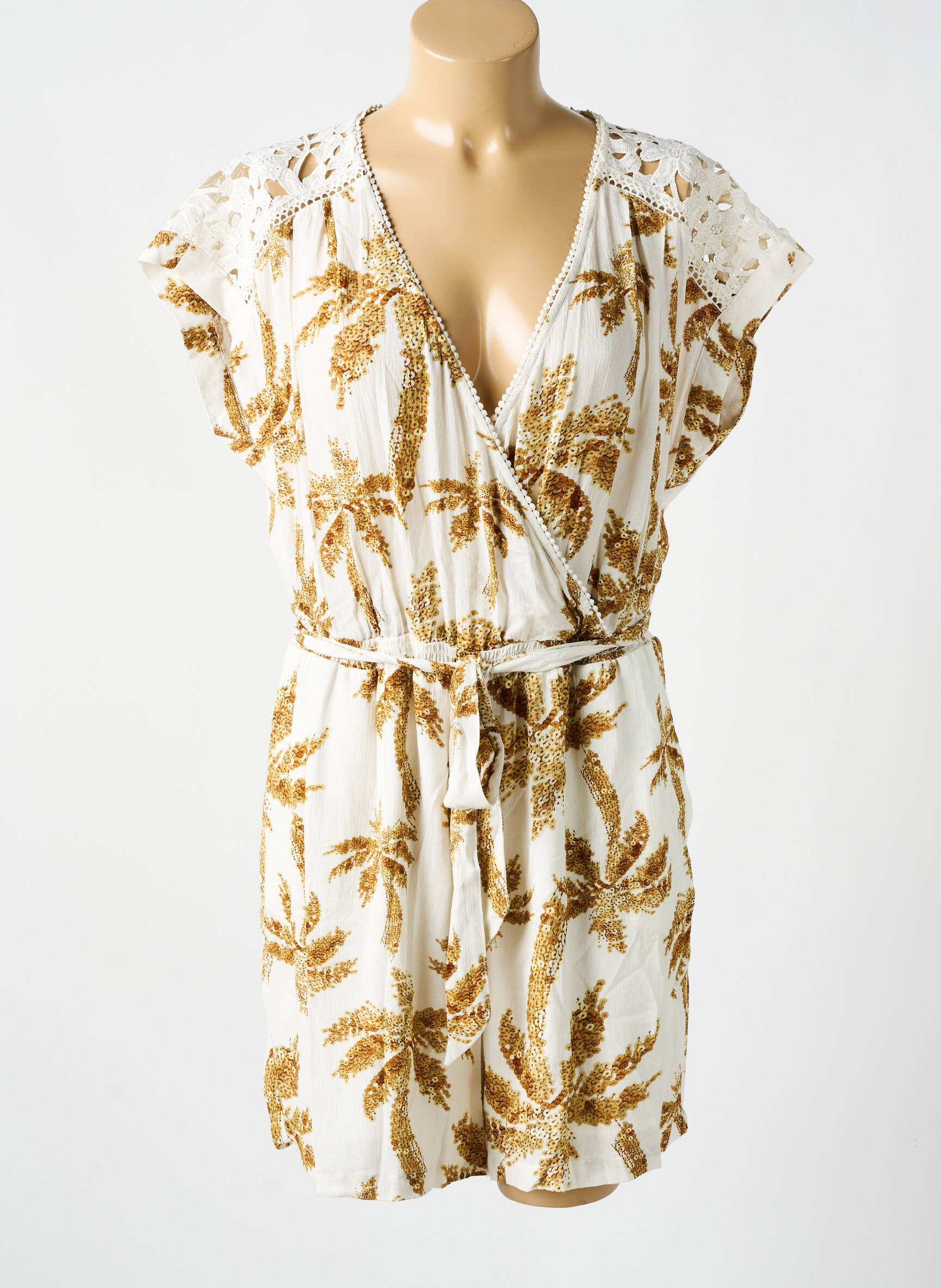 Profitez d’un superbe bon plan avec ce combishorts Esqualo pour femme, affichant un style bohème et raffiné parfait pour les journées ensoleillées. Avec son tissu fluide imprimé de motifs feuillus dorés et sa coupe portefeuille à décolleté croisé, il allie élégance décontractée et féminité. Le détail en dentelle ajourée sur les épaules ainsi que la ceinture à nouer marquent joliment la taille, pour une silhouette flatteuse et un confort optimal à prix mini.
